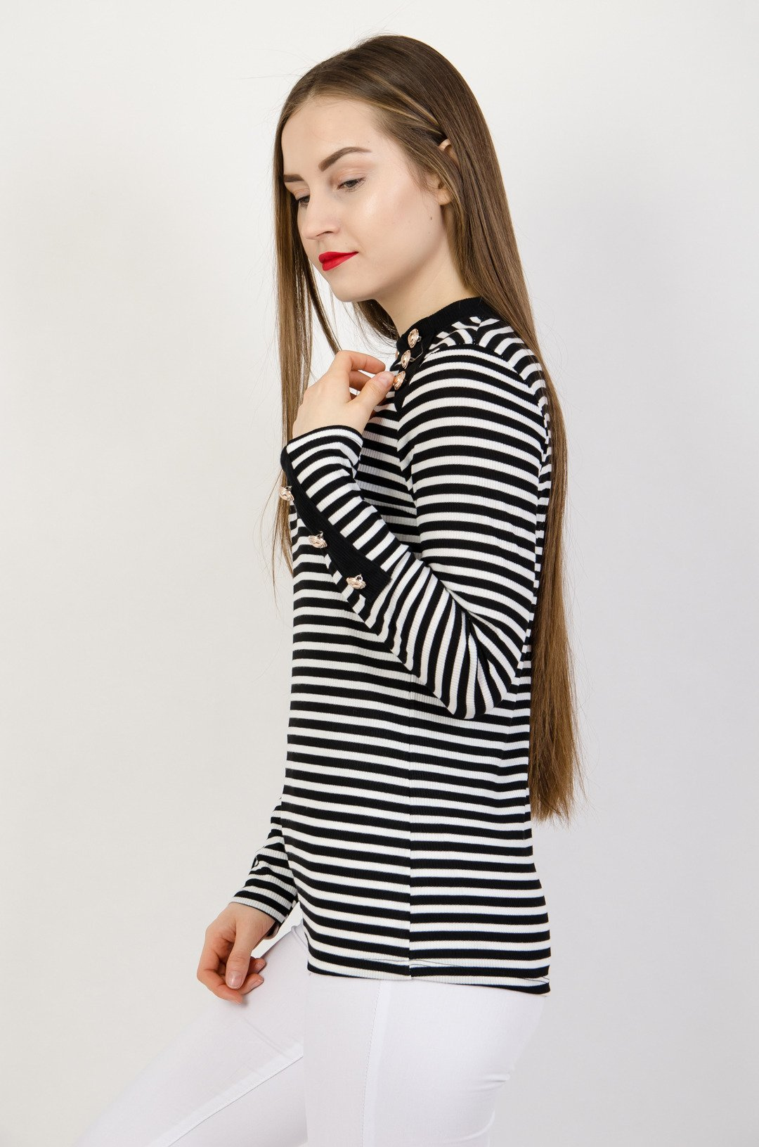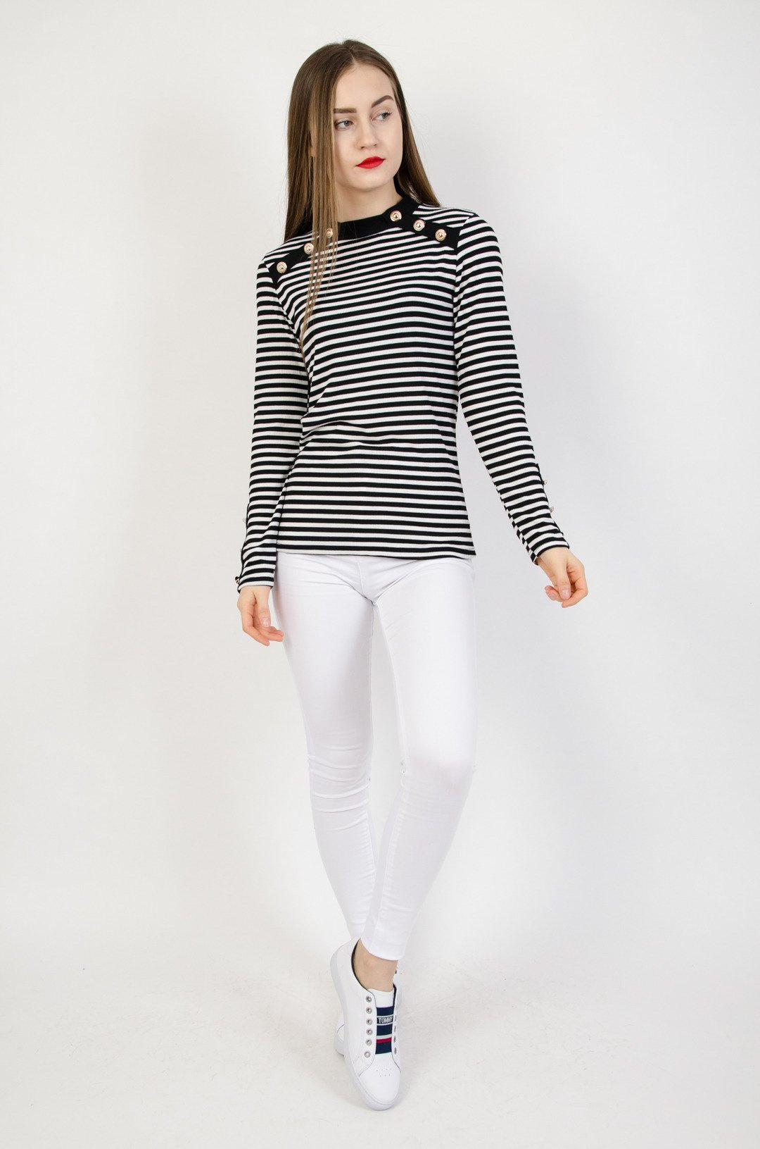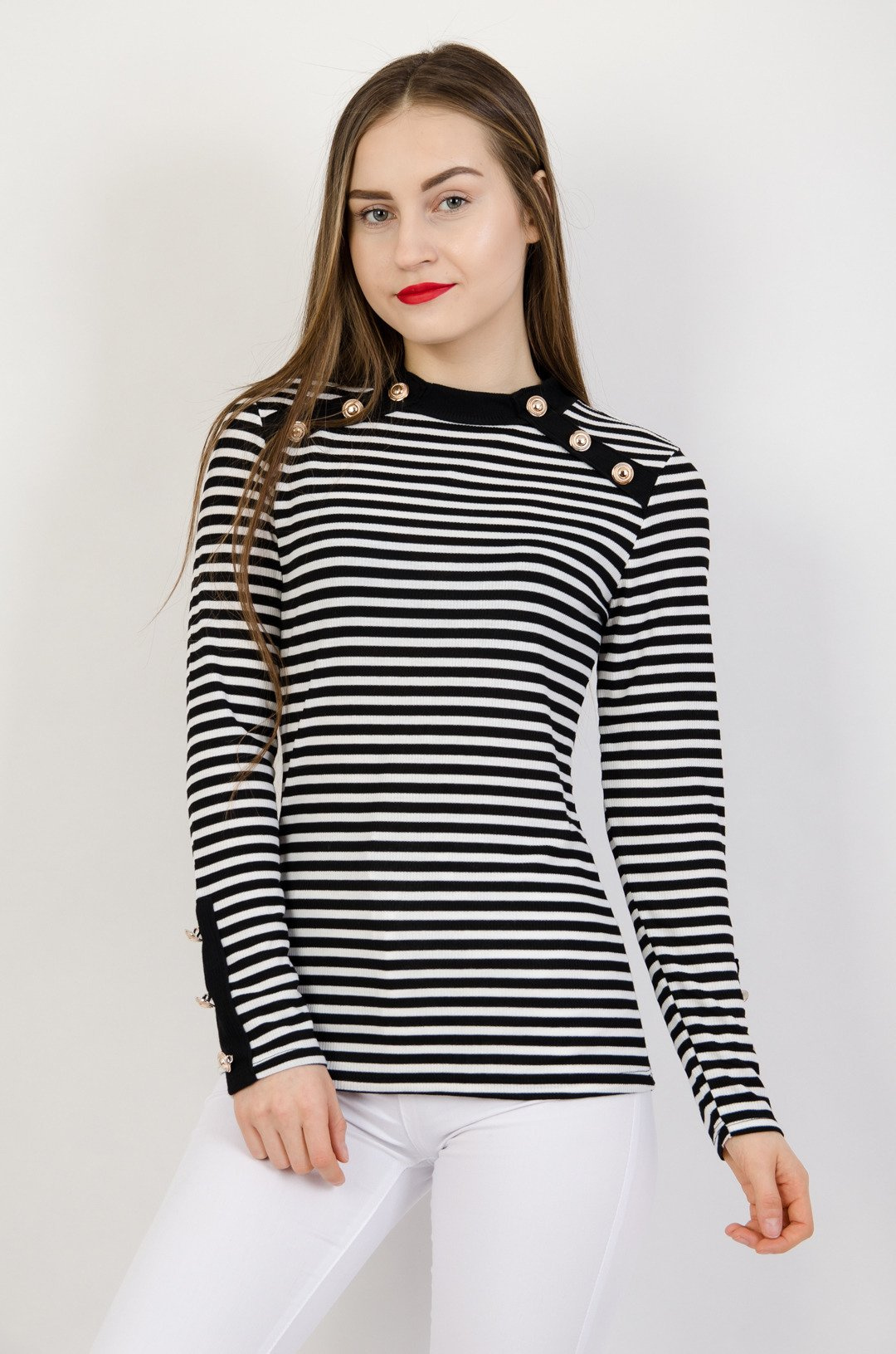 Prążkowana bluzka w biało czarne paski ze złotymi guzikami