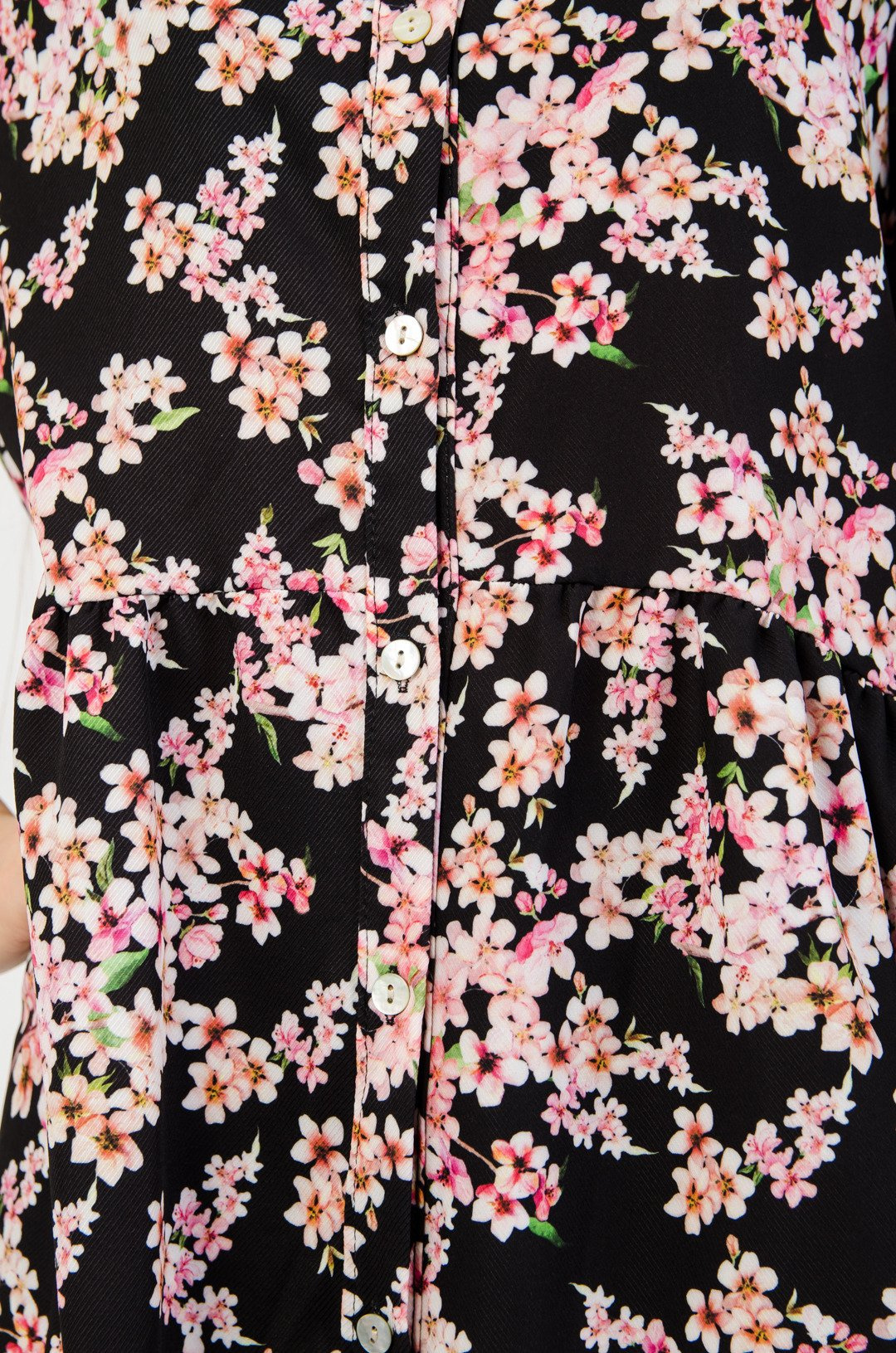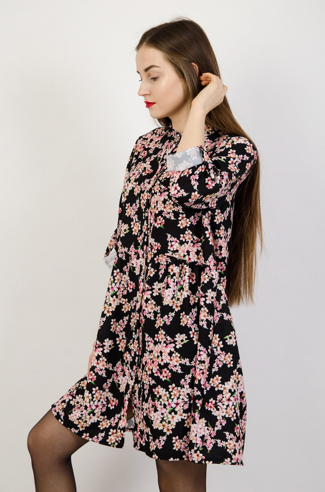 Czarna sukienka w drobne różowe kwiaty, zapinana na guziki.