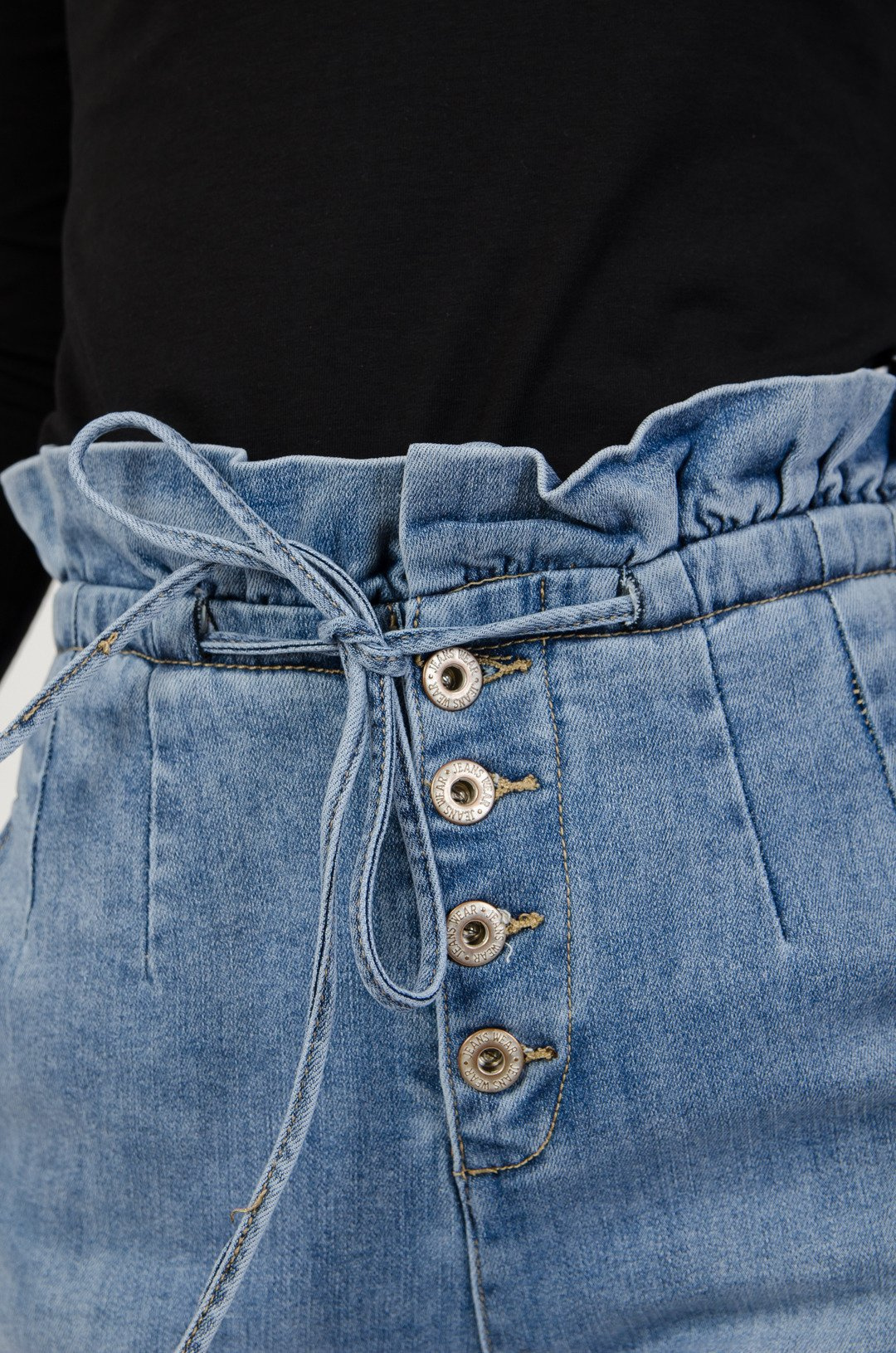 Jasne spodnie jeansowe haremki z falbaną w pasie