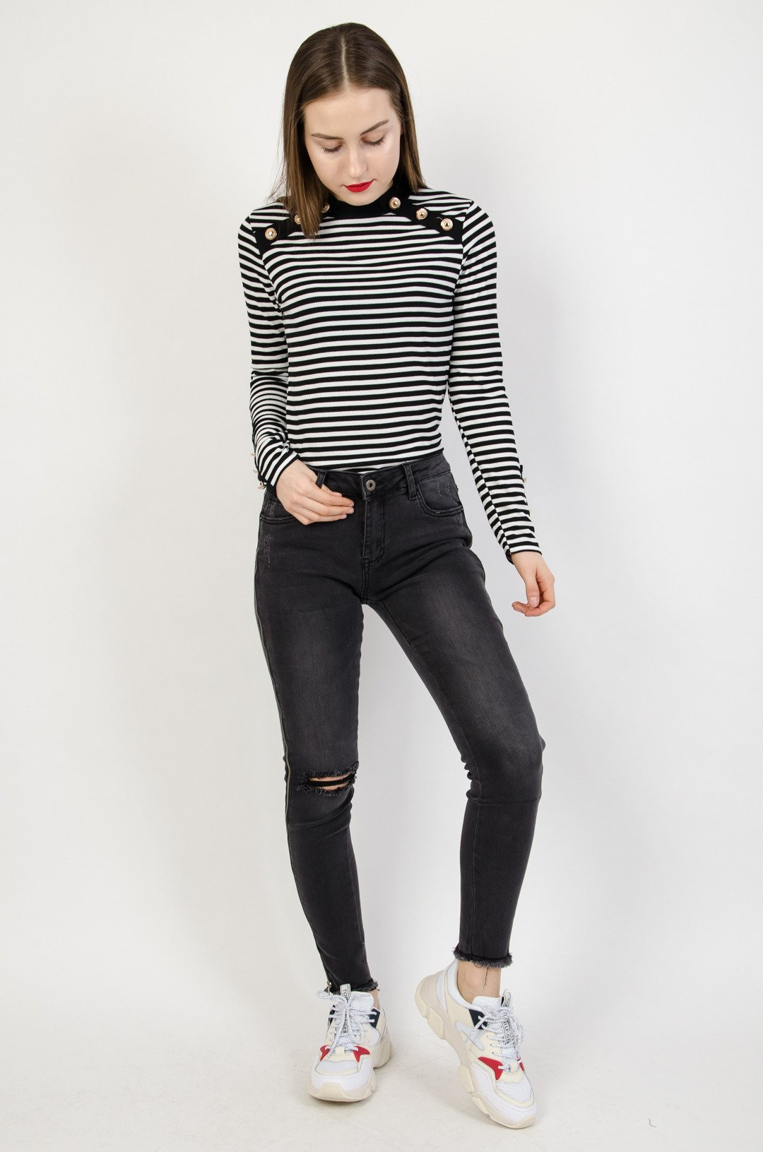 Szare spodnie jeansowe z lampasami suwakami