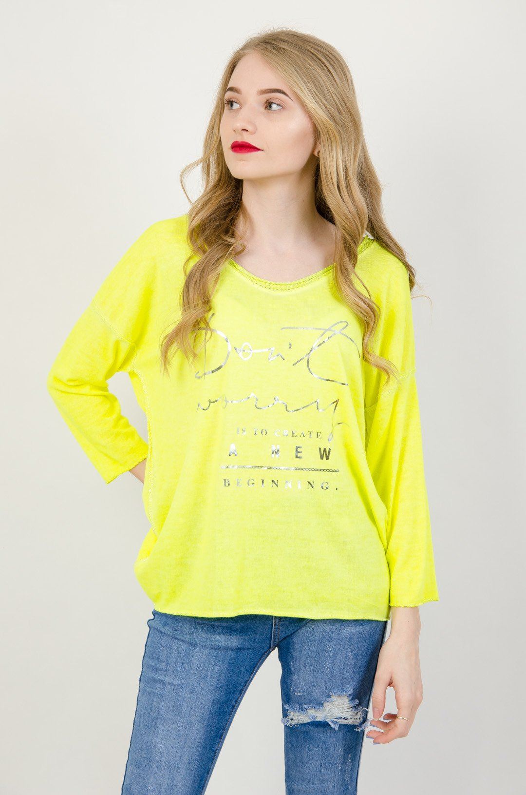 Żółta neonowa bluzka wyszywana srebrną nicią z napisem