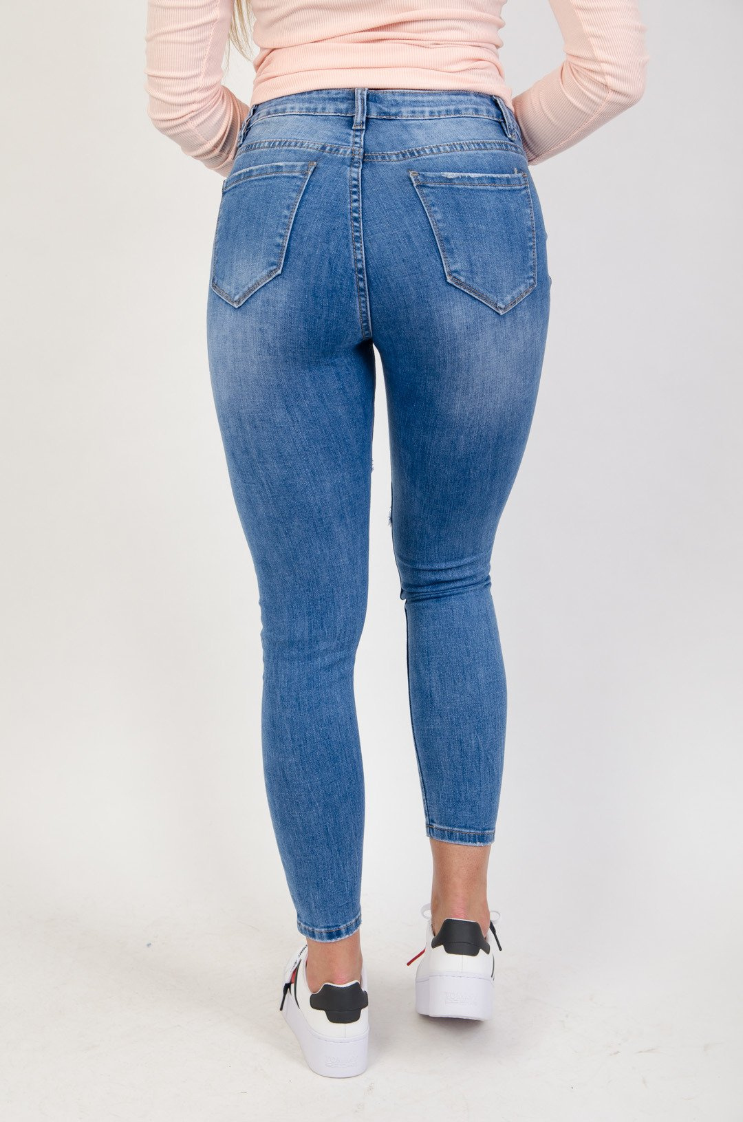 Jasne spodnie jeansowe z dużymi szarpaniami.