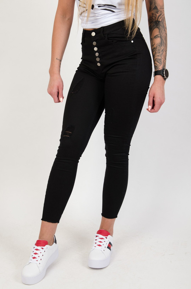 Czarne spodnie jeansowe z przetarciami zapinane na guziki.