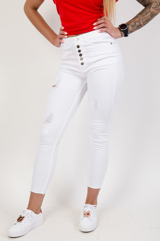 Białe spodnie jeansowe z przetarciami zapinane na guziki.