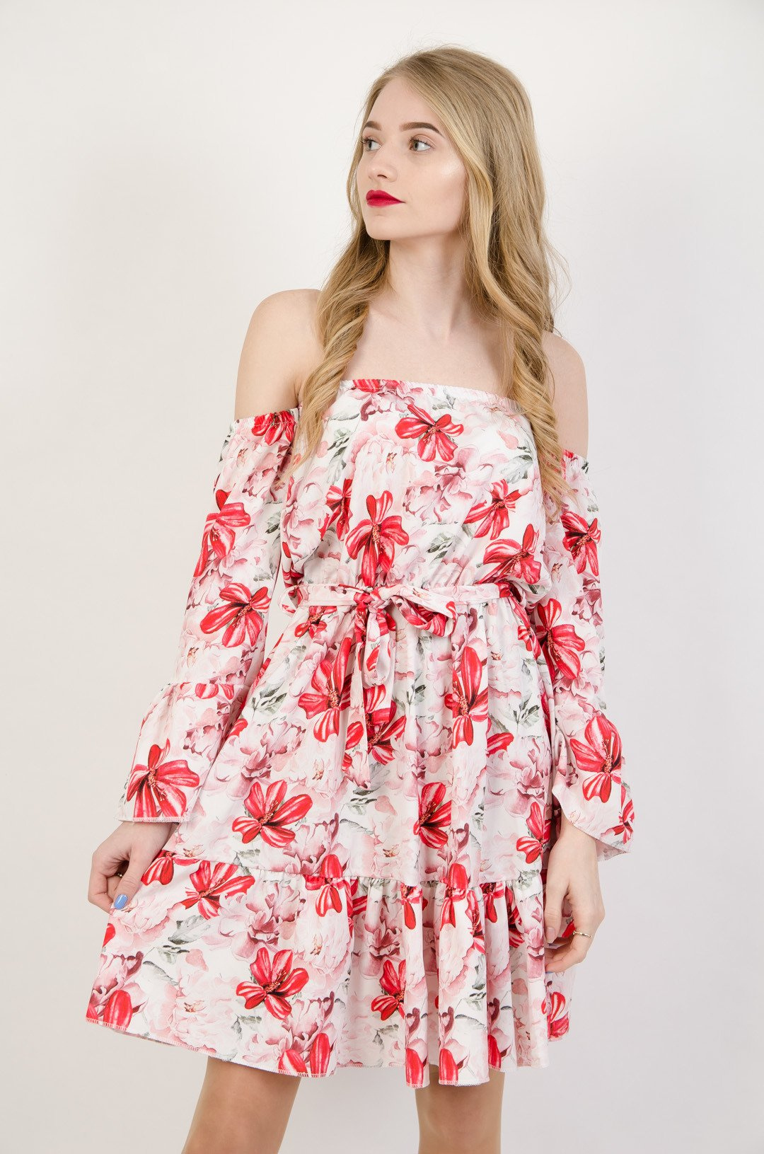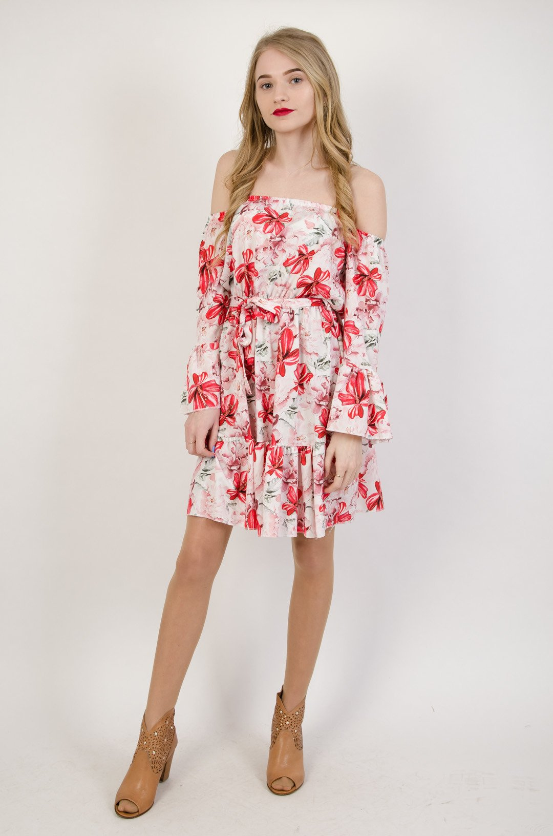 Biała sukienka w czerwone kwiaty z odkrytymi ramionami.