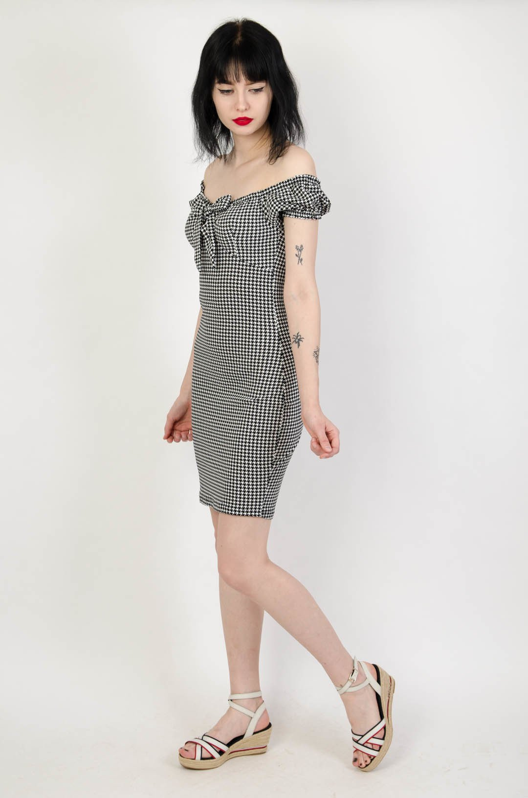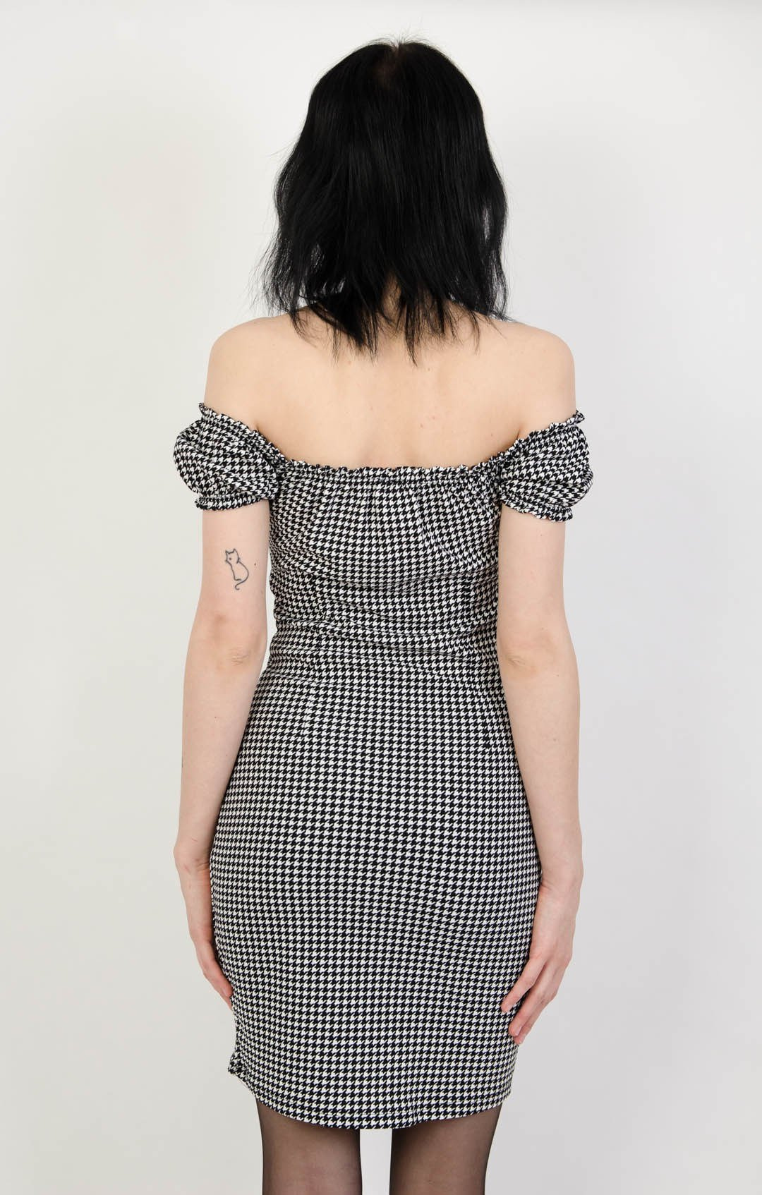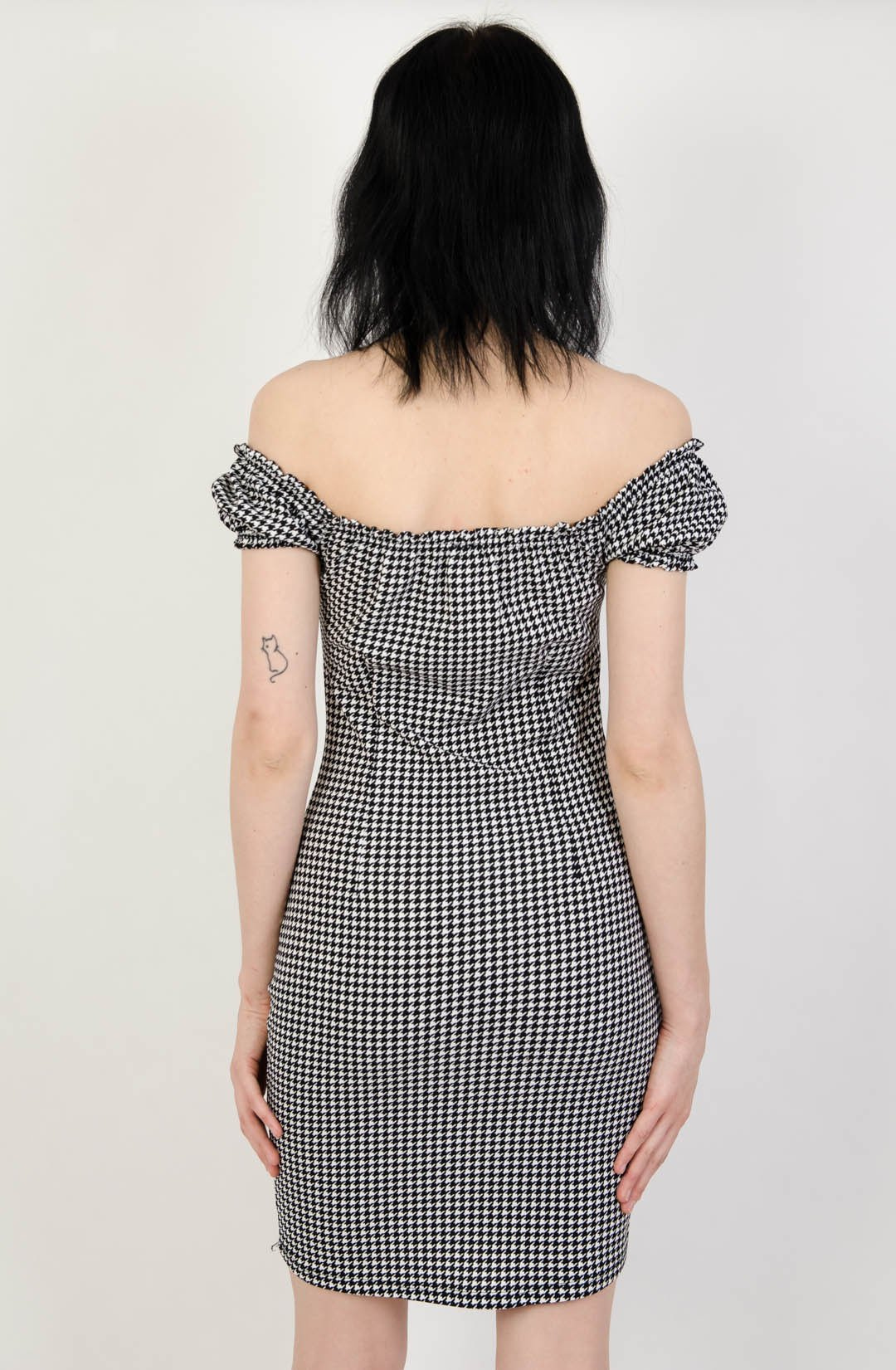 Dopasowana sukienka w pepitkę z odkrytymi ramionami.