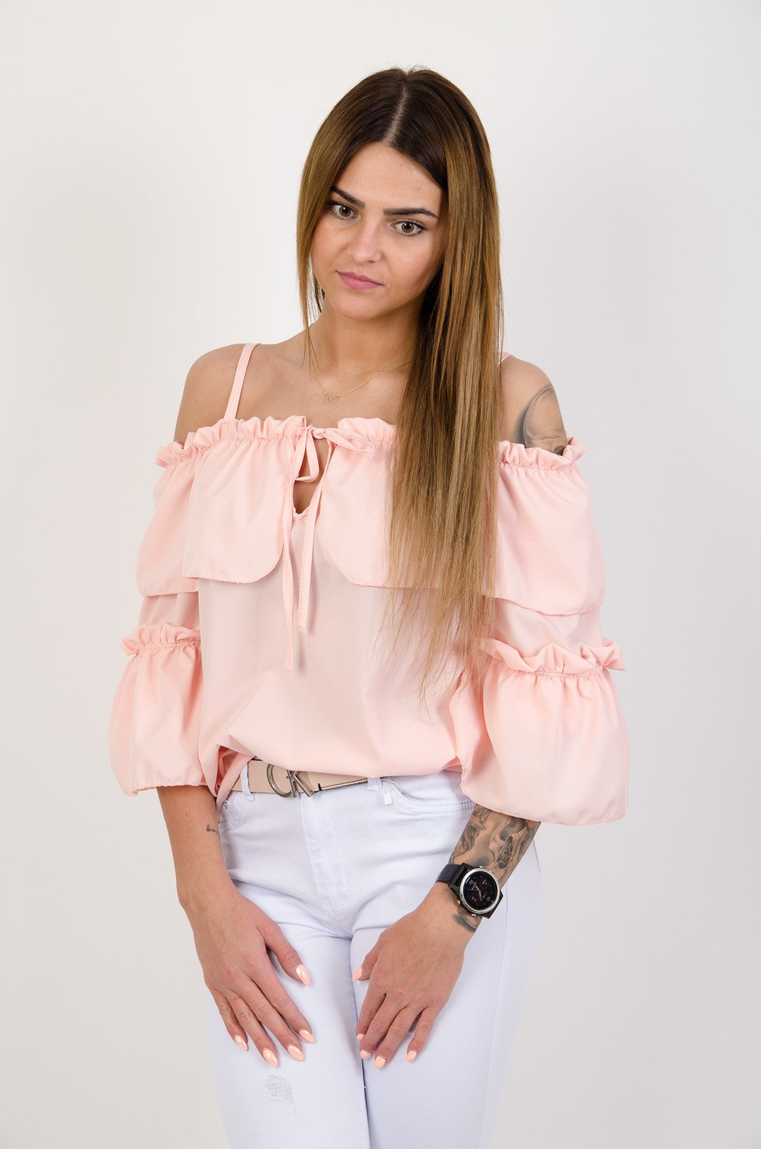 Różowa bluzka hiszpanka z wiązaniem przy dekolcie