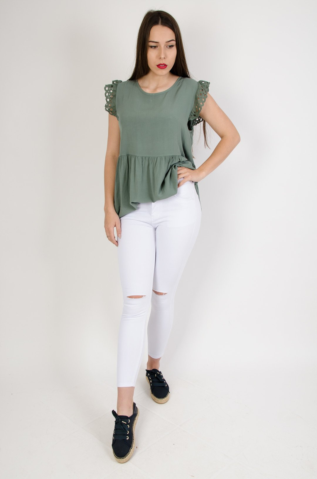Białe dopasowane spodnie z rozcięciami na kolanach.