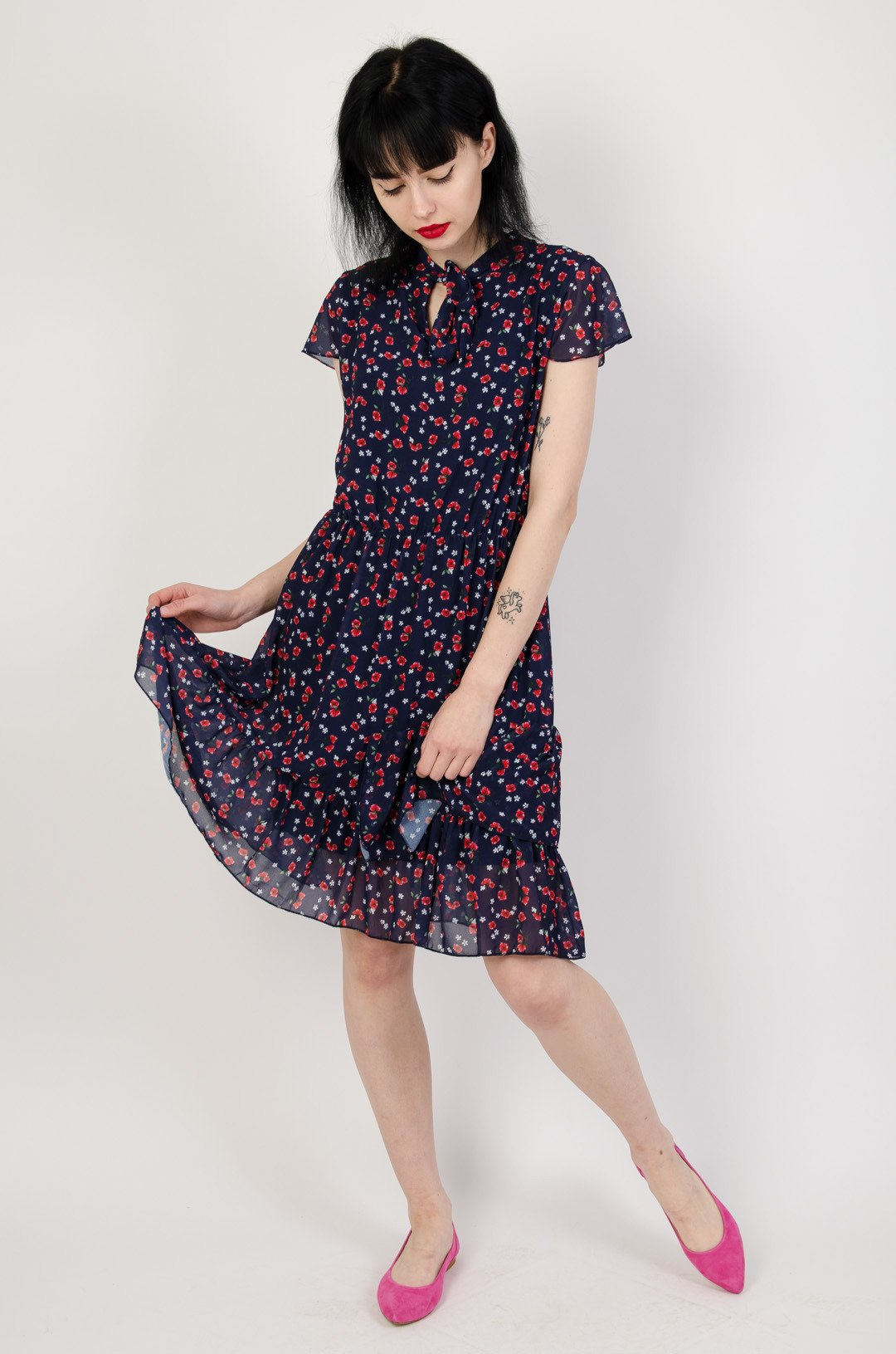 Granatowa sukienka w czerwone kwiatki z gumą w pasie