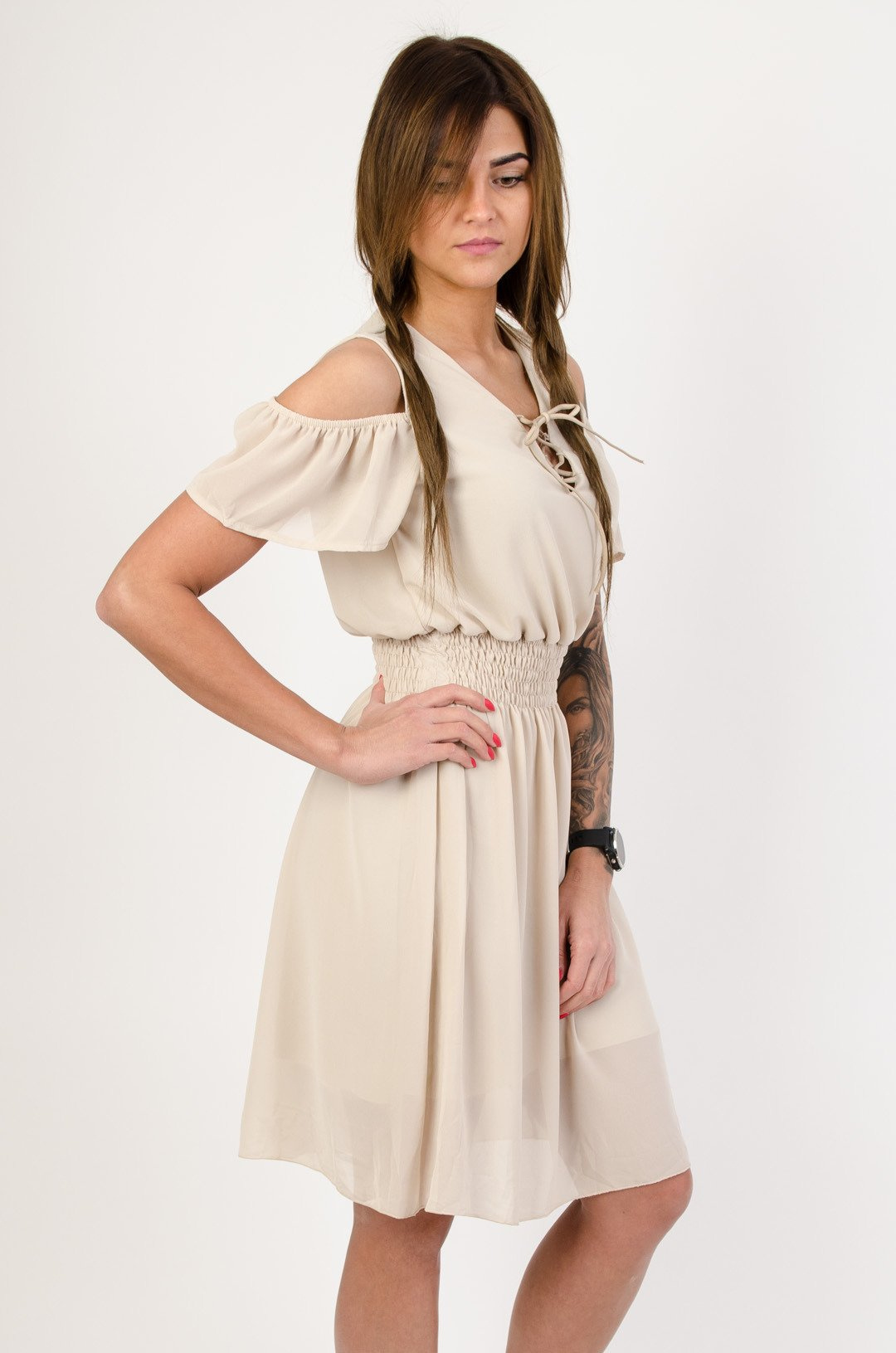 Beżowa sukienka z wiązaniem w dekolcie oraz gumą w pasie.