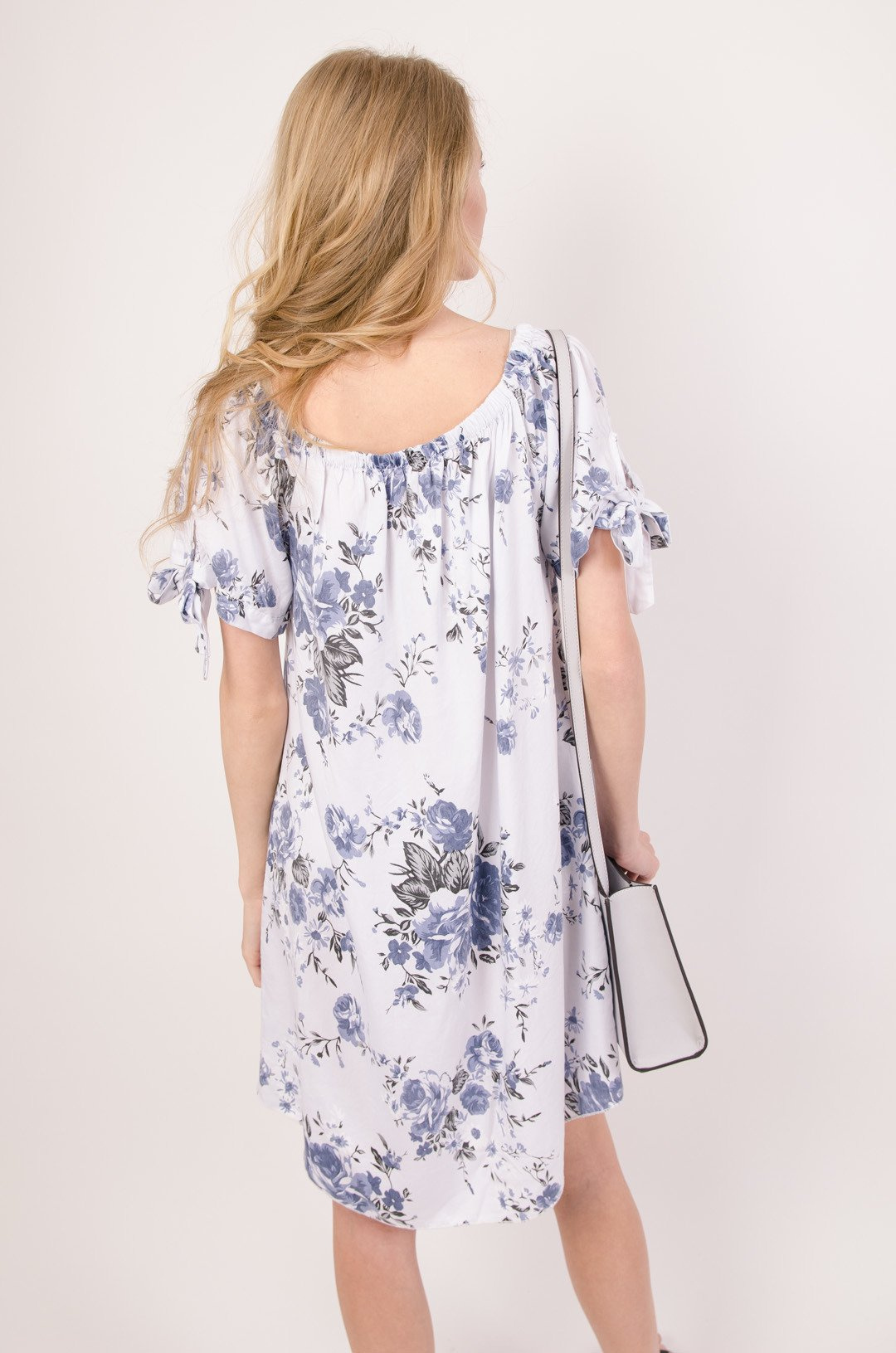 Biała tunika w niebieskie kwiaty z wiązanymi rękawami