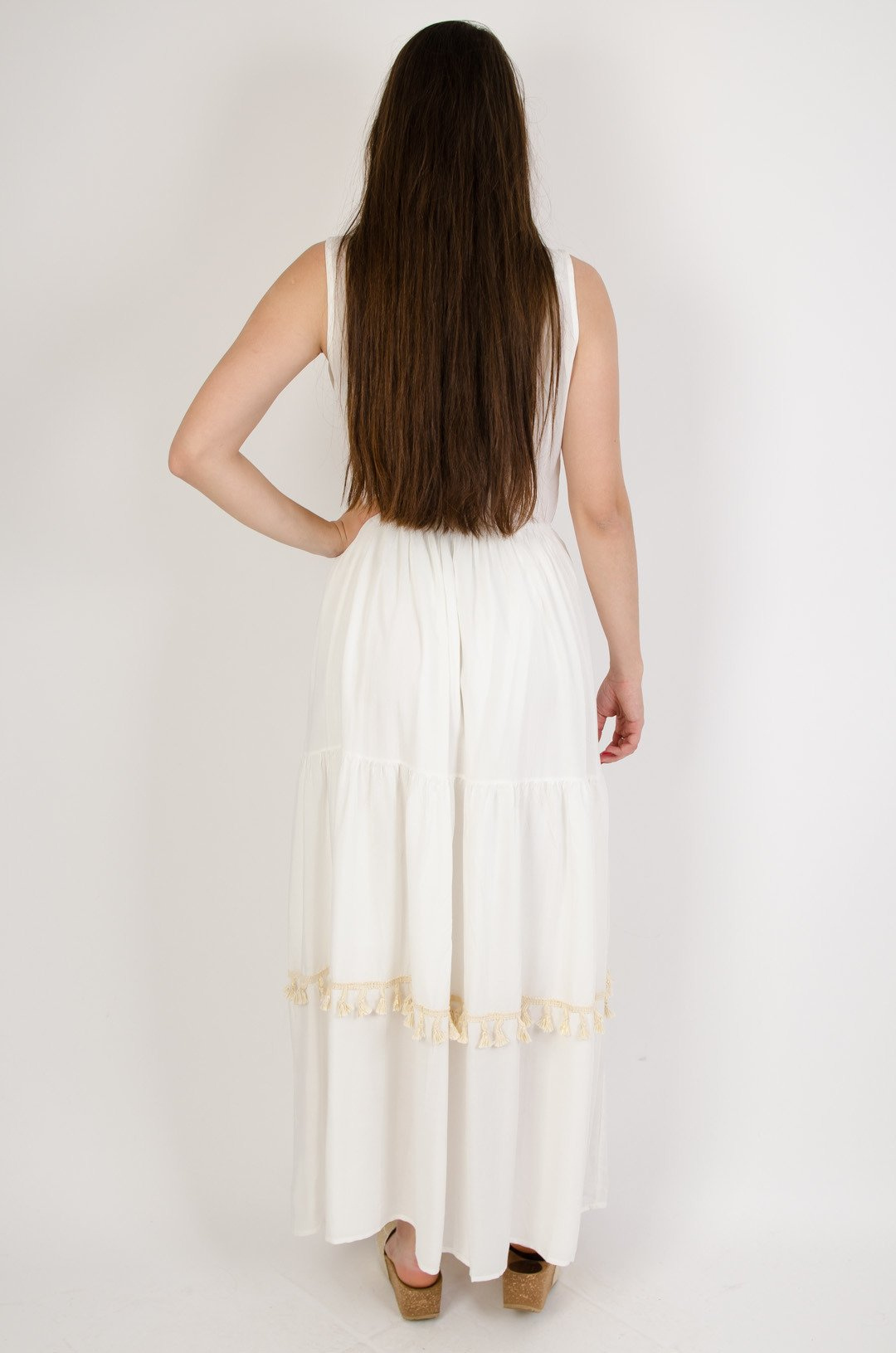 Długa sukienka ze złotymi cekinami obszyta pastelowymi frędzlami