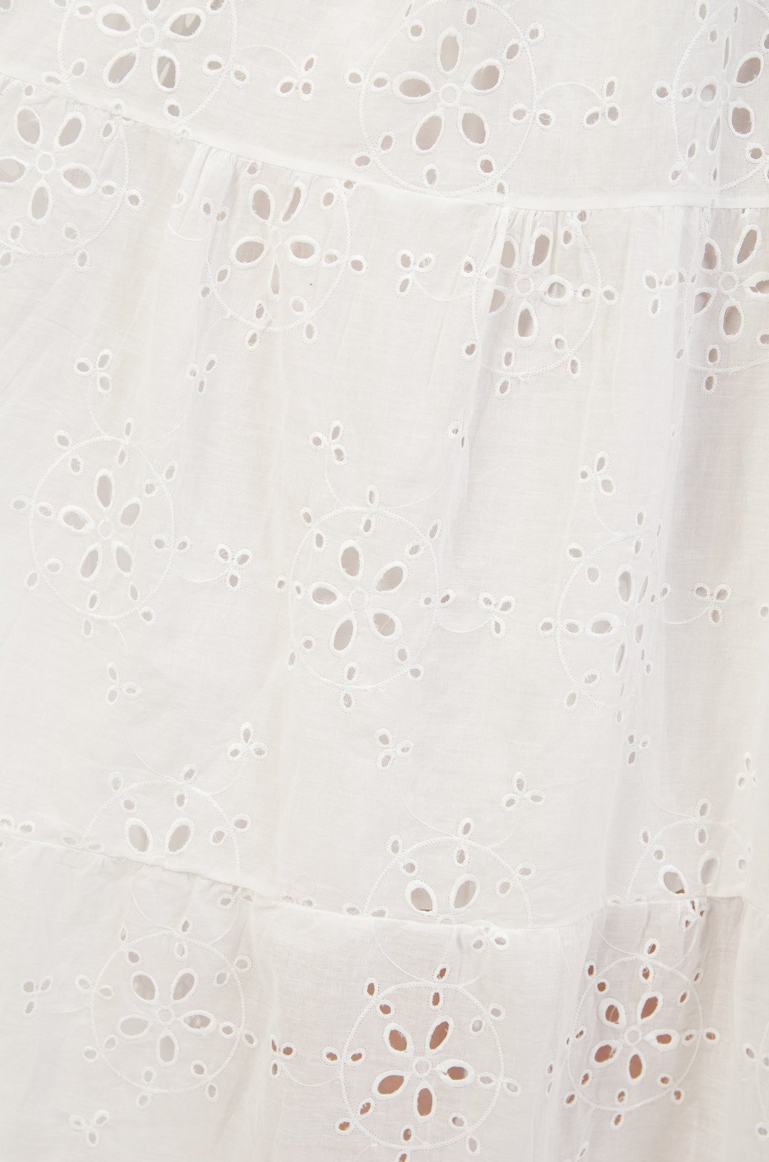 Biała długa ażurowa sukienka z hiszpańskim dekoltem zakończonym koronką