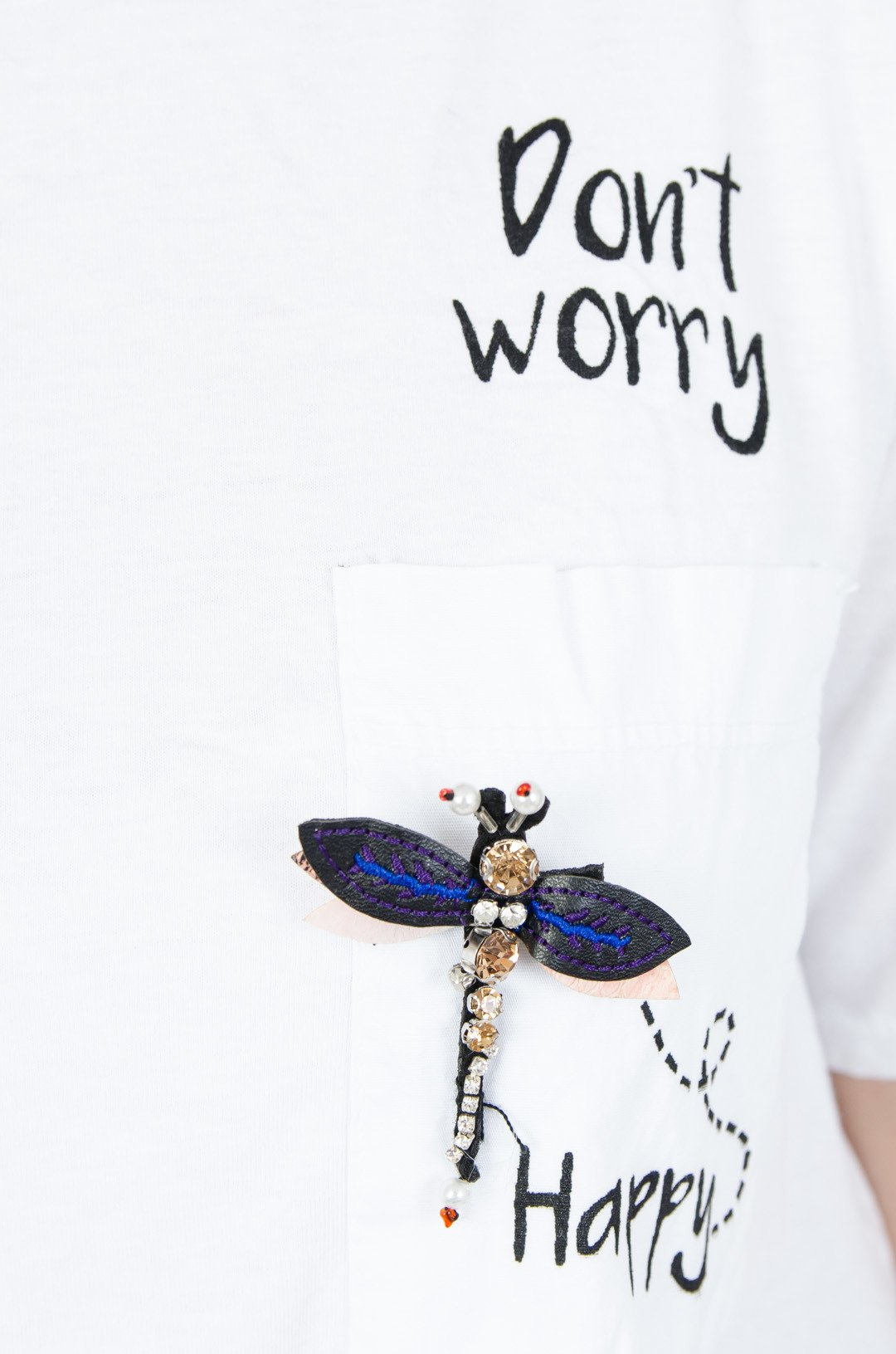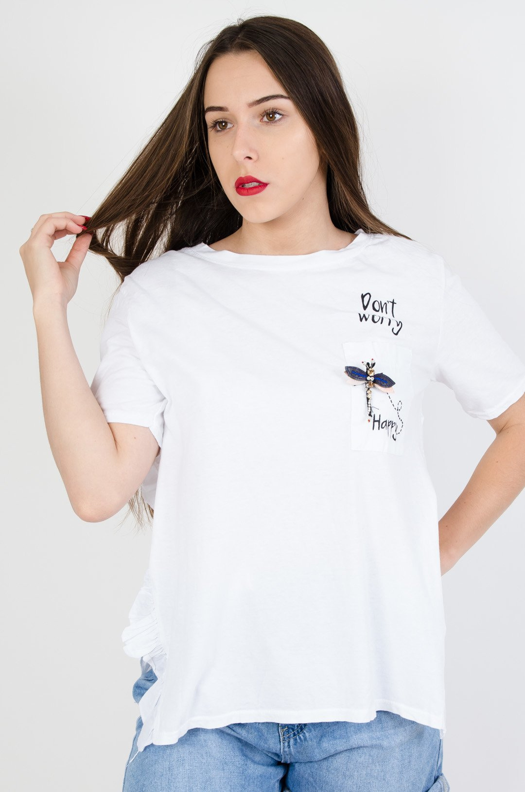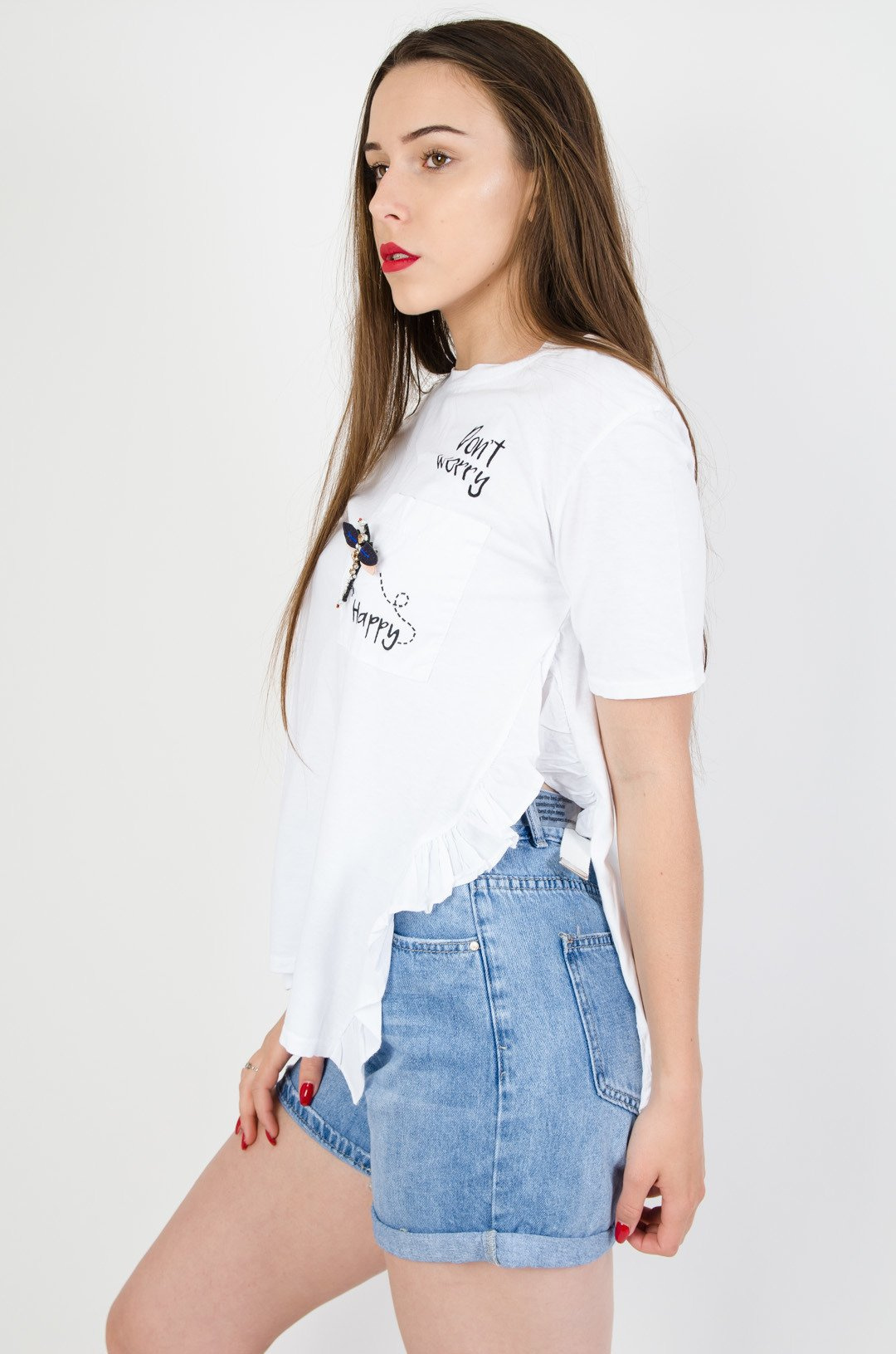 Biała bluzka z rozcięciami oraz falbankami po bokach