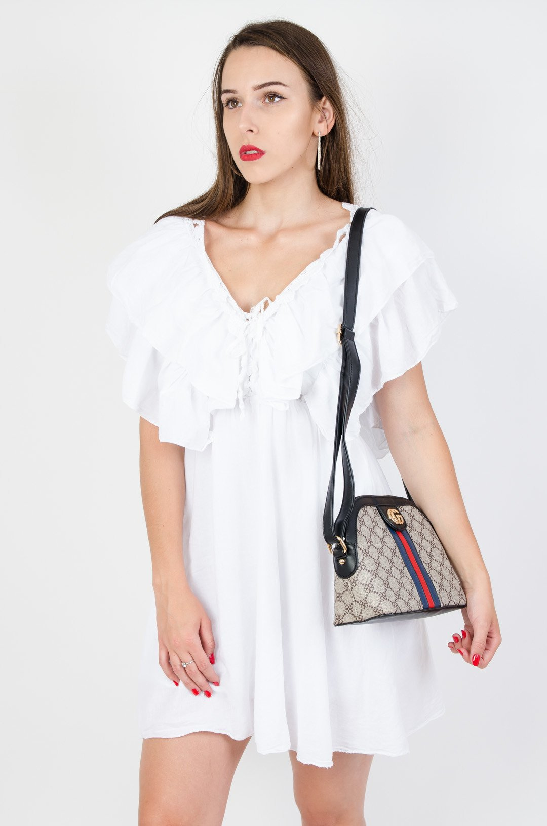 Wzorzysta torebka z czerwono-granatowym paskiem na przodzie