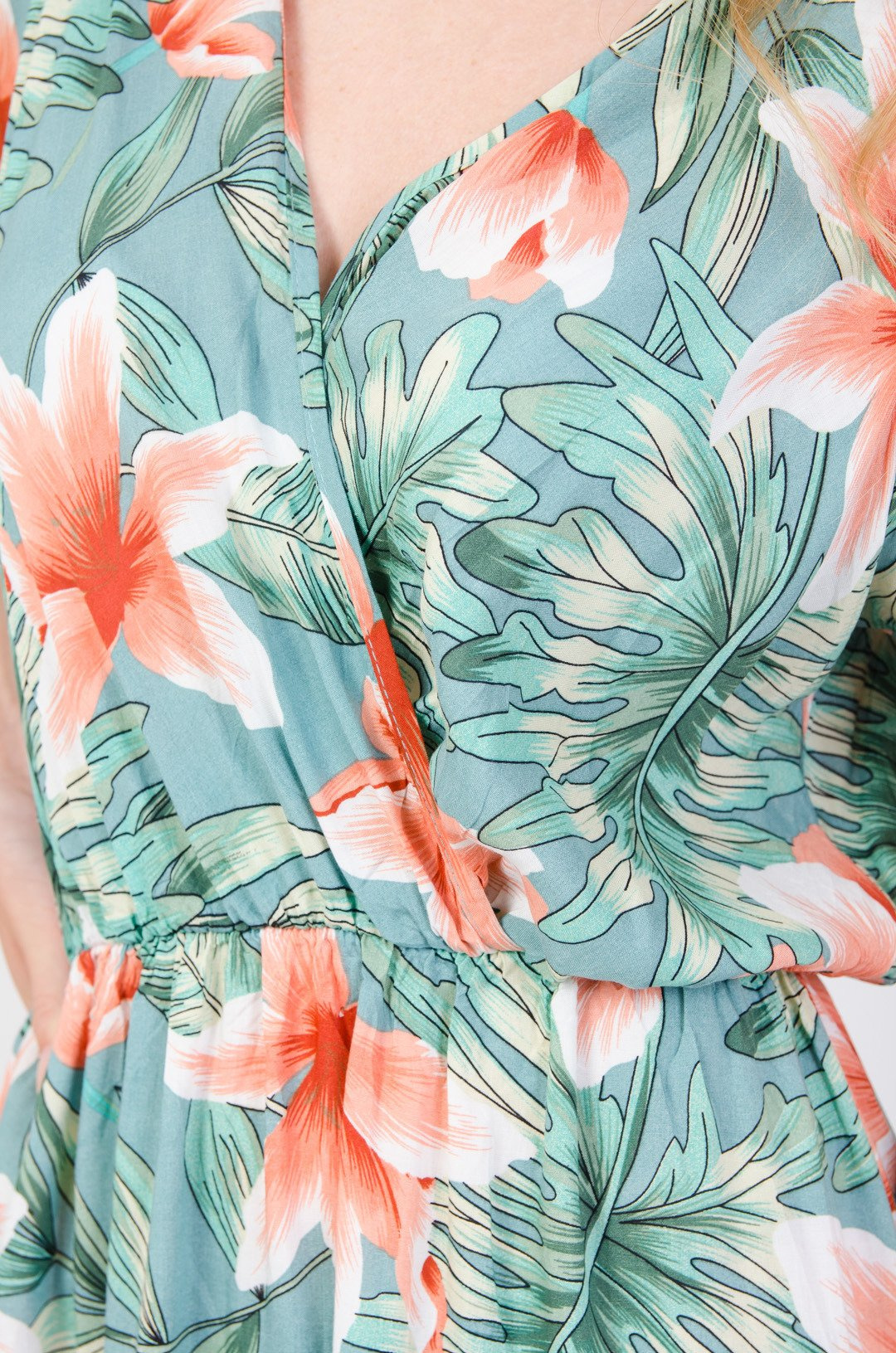 Zielona sukienka w kwiaty z kopertowym dekoltem