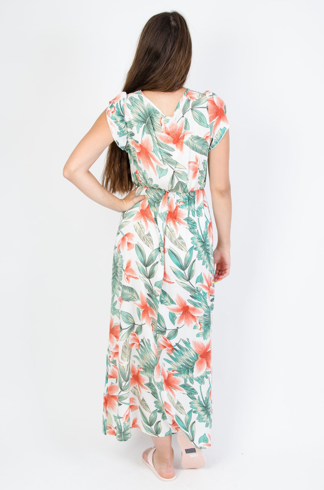 Biała sukienka w kwiaty z kopertowym dekoltem