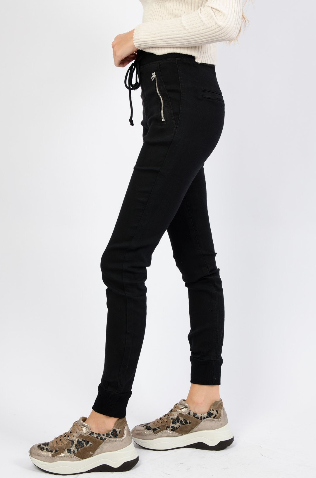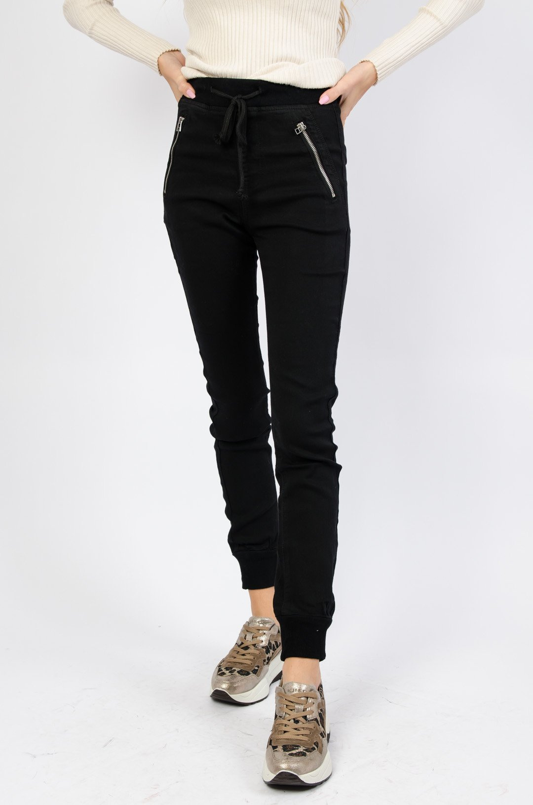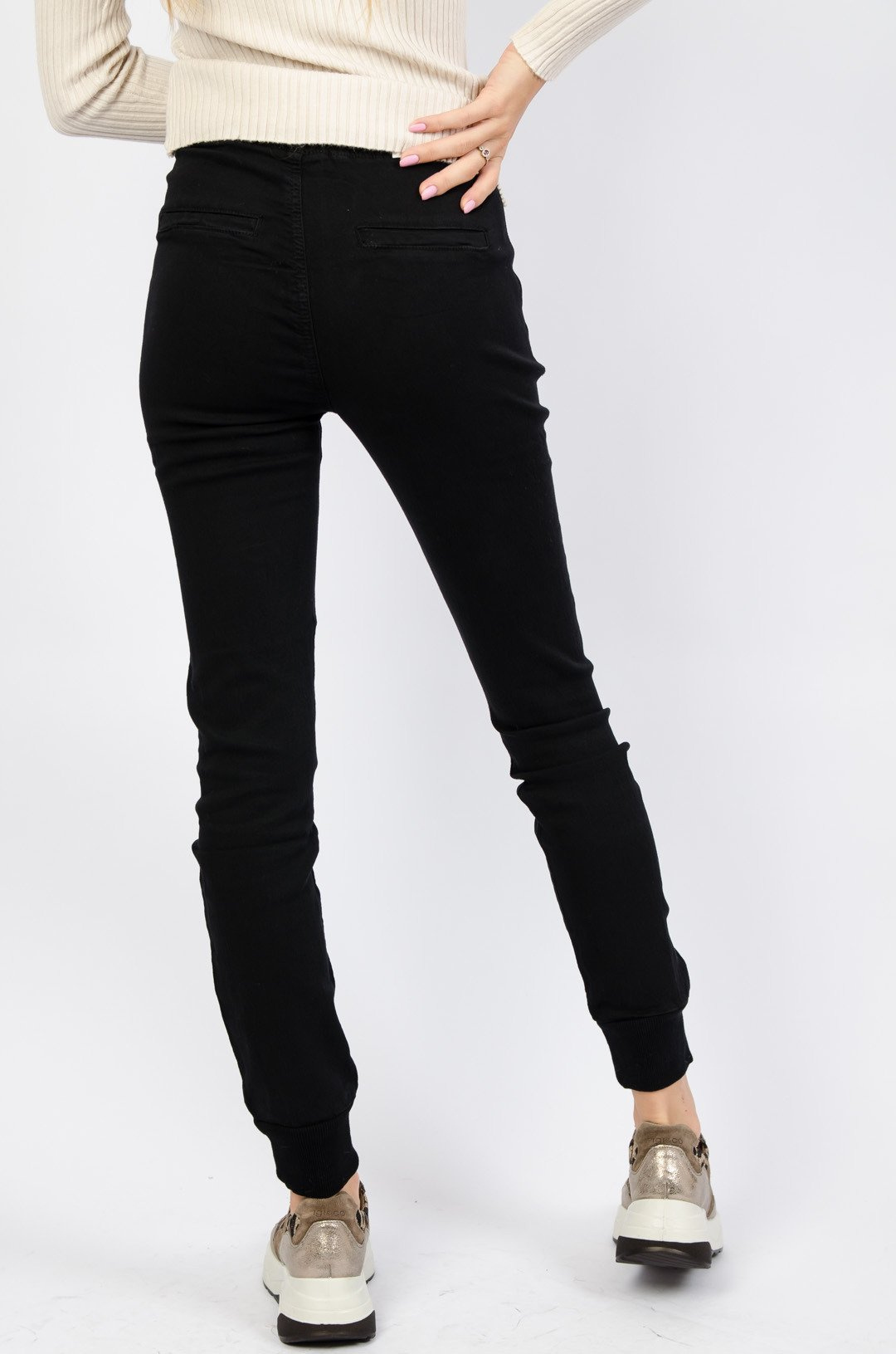 Czarne spodnie ze ściągaczem na dole oraz gumką w pasie