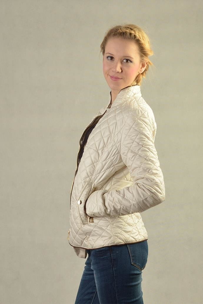 Taliowana, bardzo stylowa pikowana kurtka ze stójką, zapinana na zamek. Z przodu dwie kieszenie, zapinane na ozdobny zamek, oraz zatrzask. Na rękawach ozdobne zamki.