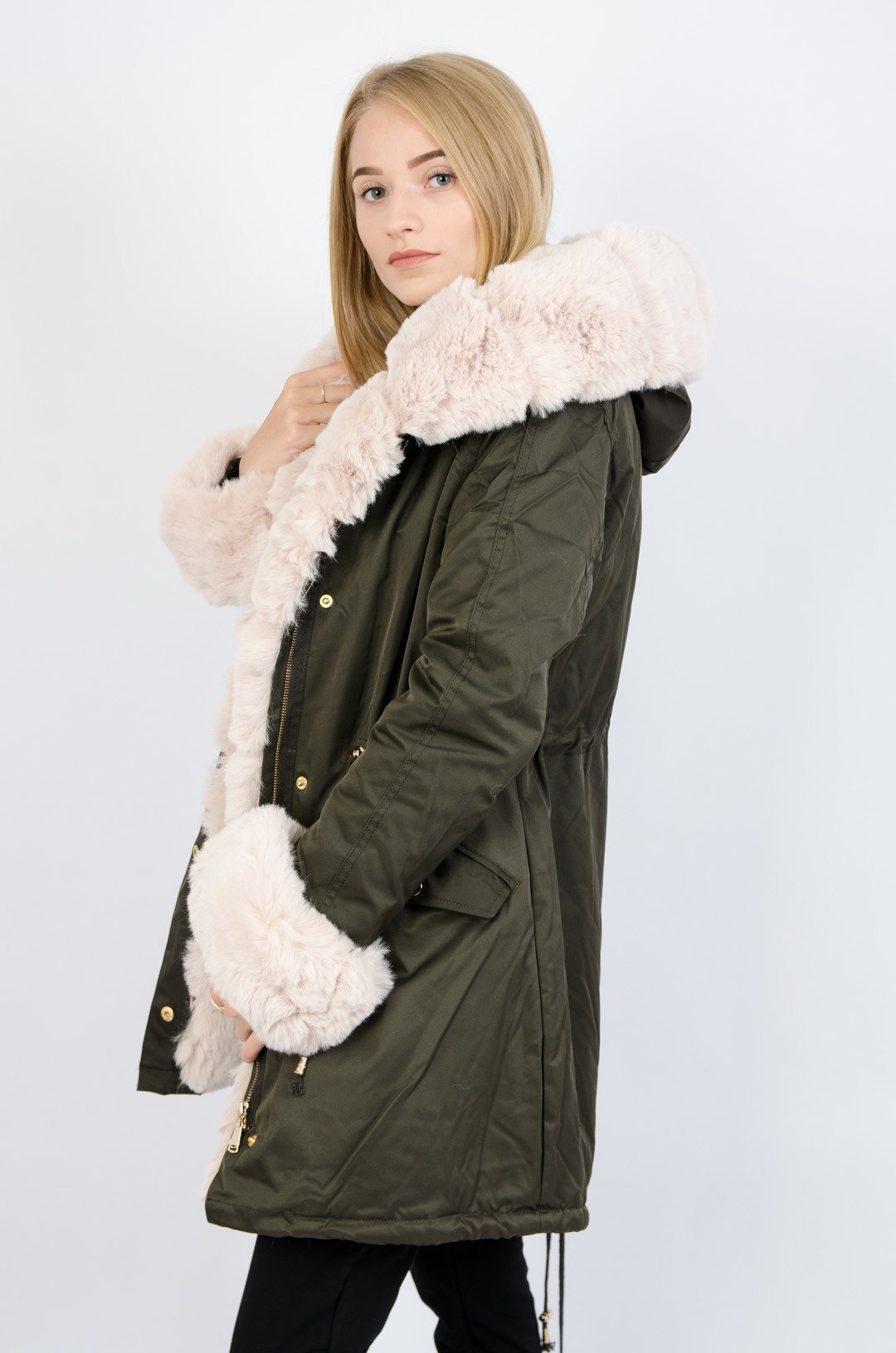 Zielona kurtka parka z beżowym futerkiem