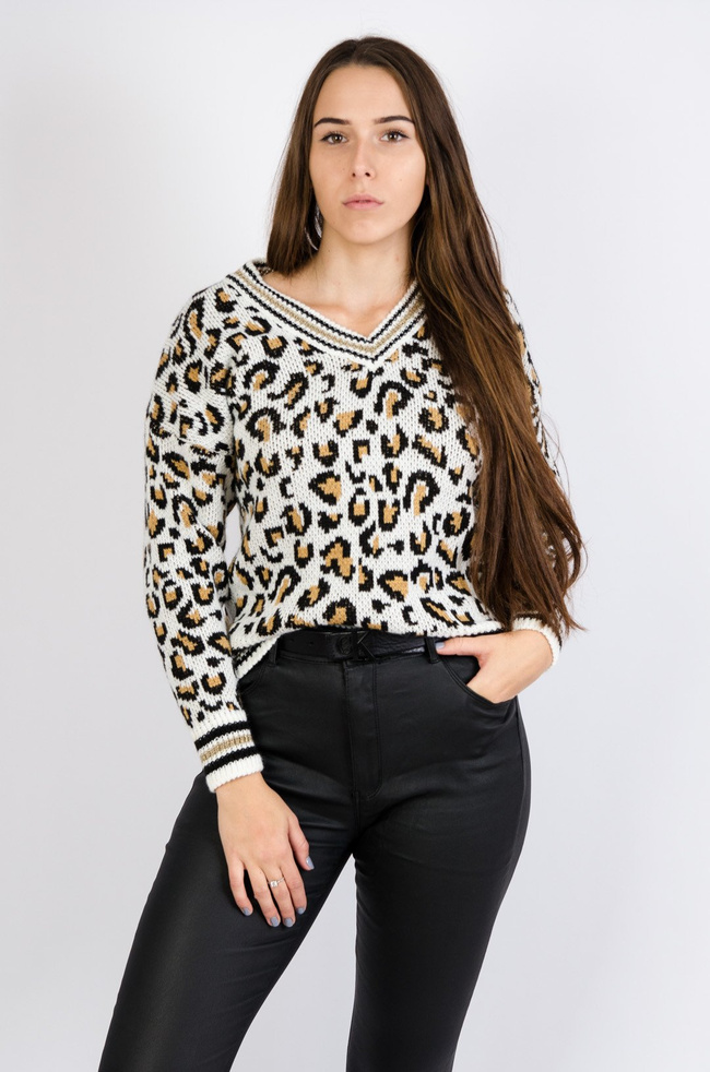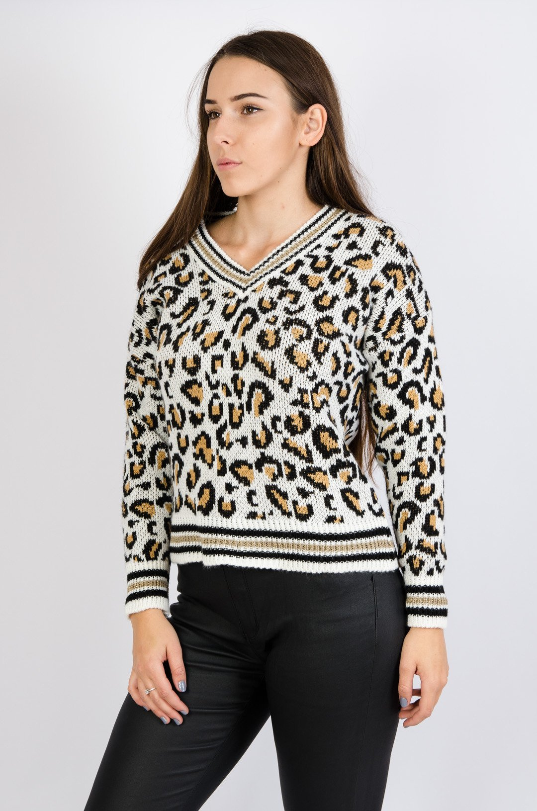 BIAŁY SWETER W PANTERKĘ- DEKOLT W SZPIC