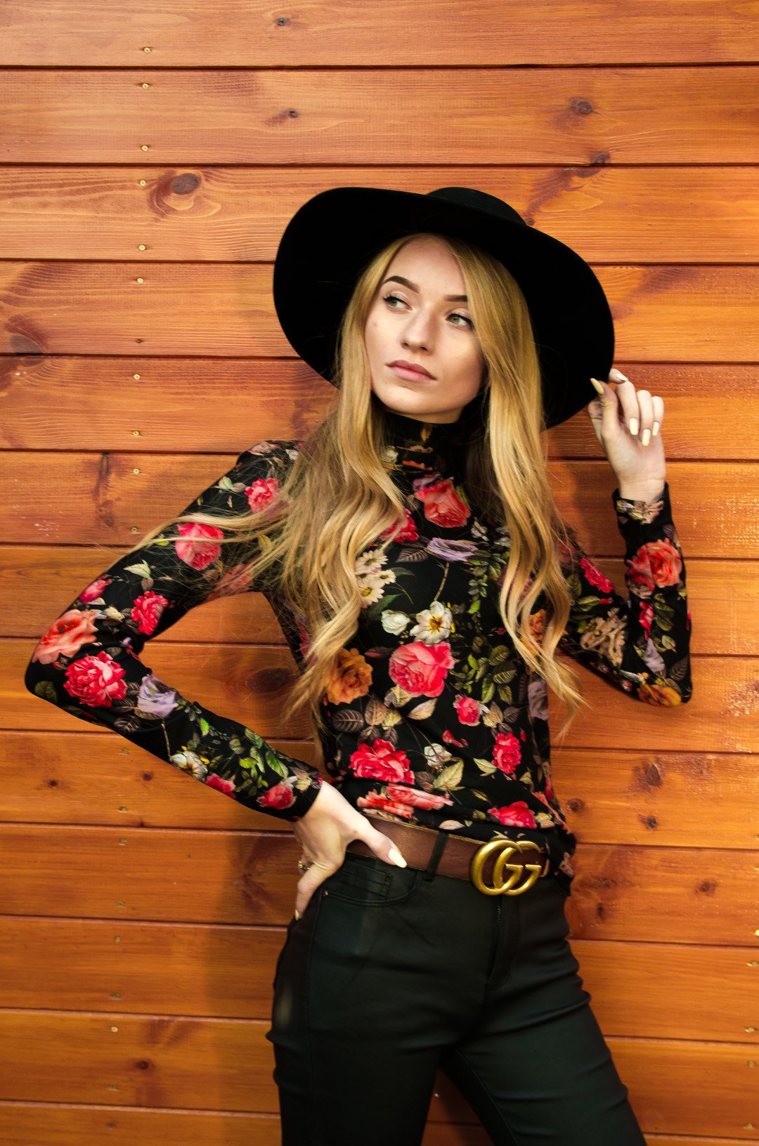CZARNA BLUZKA Z GOLFEM W KWIATY