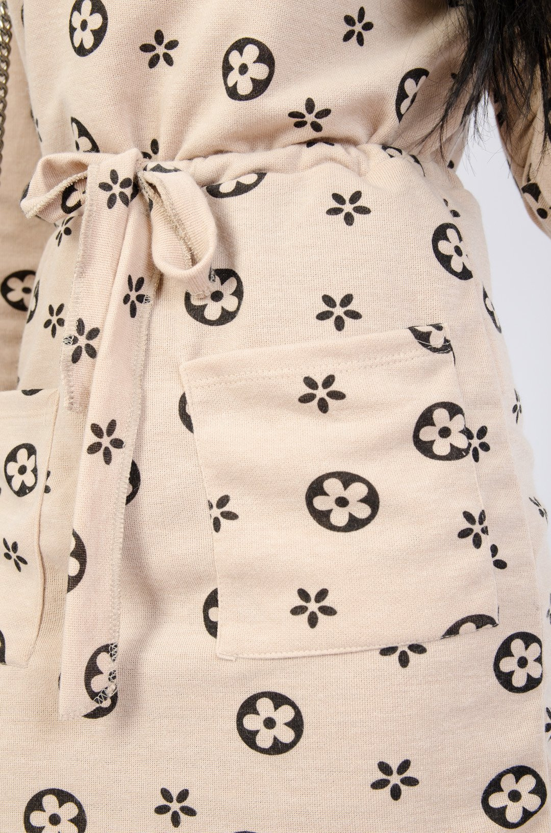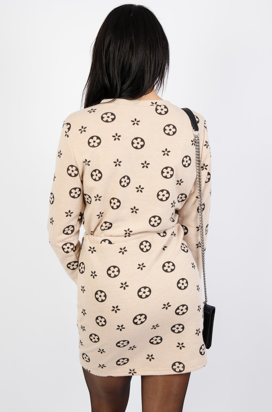 Beżowa dzianinowa sukienka w brązowe wzory.