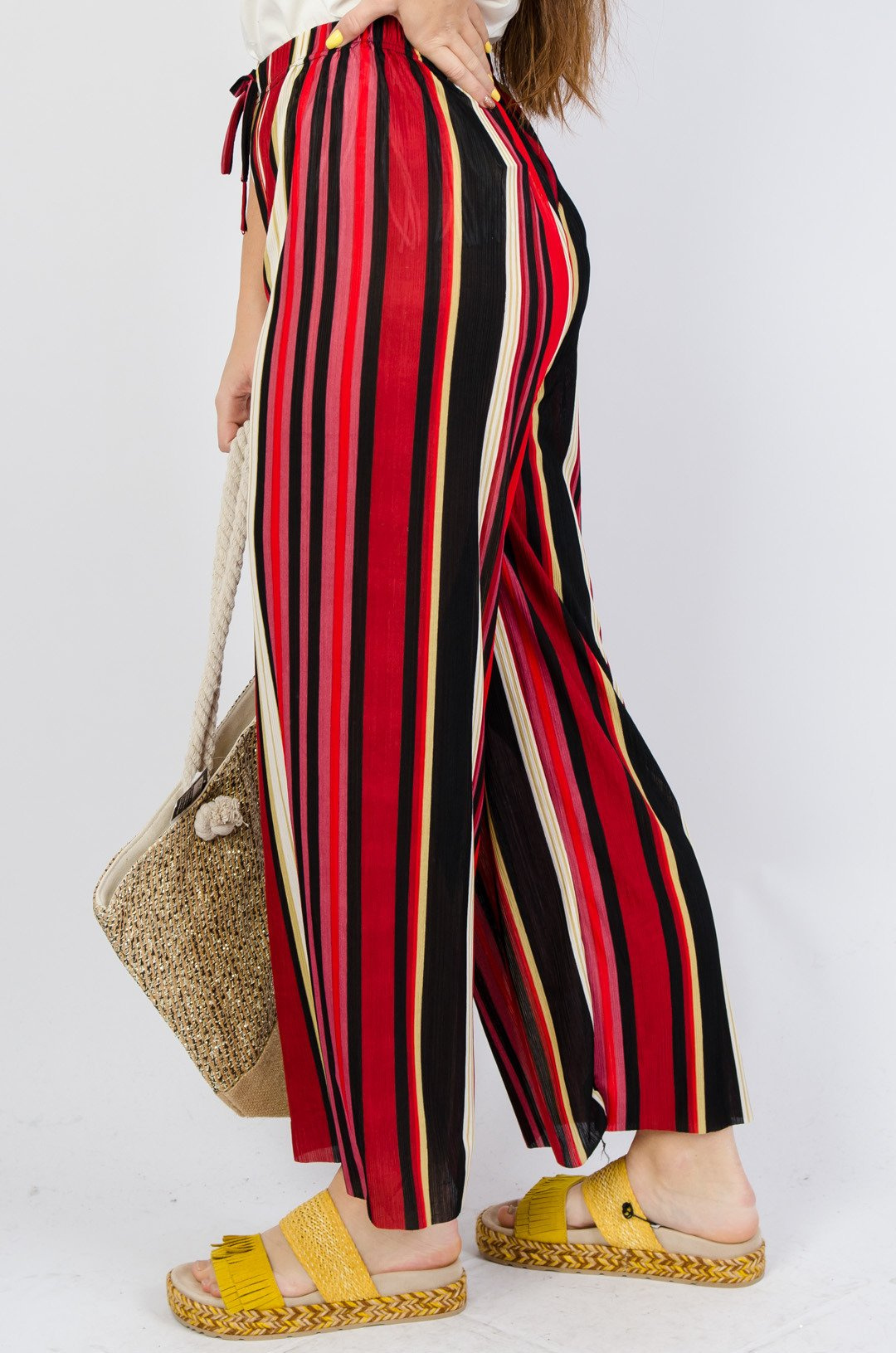 Kolorowe spodnie w paski z rozszerzanymi nogawkami