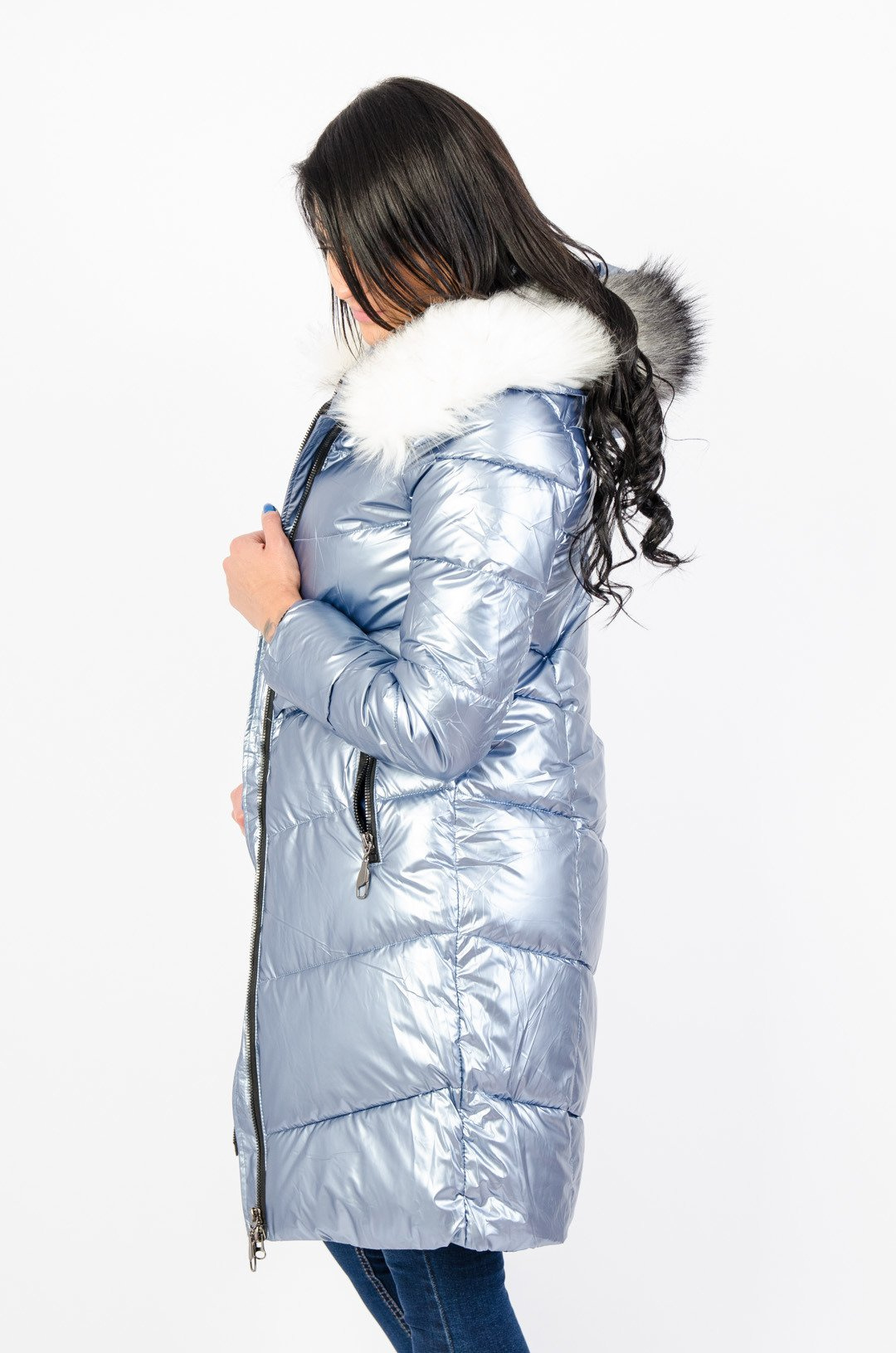 Niebieski metaliczny pikowany płaszcz z futerkiem przy kapturze