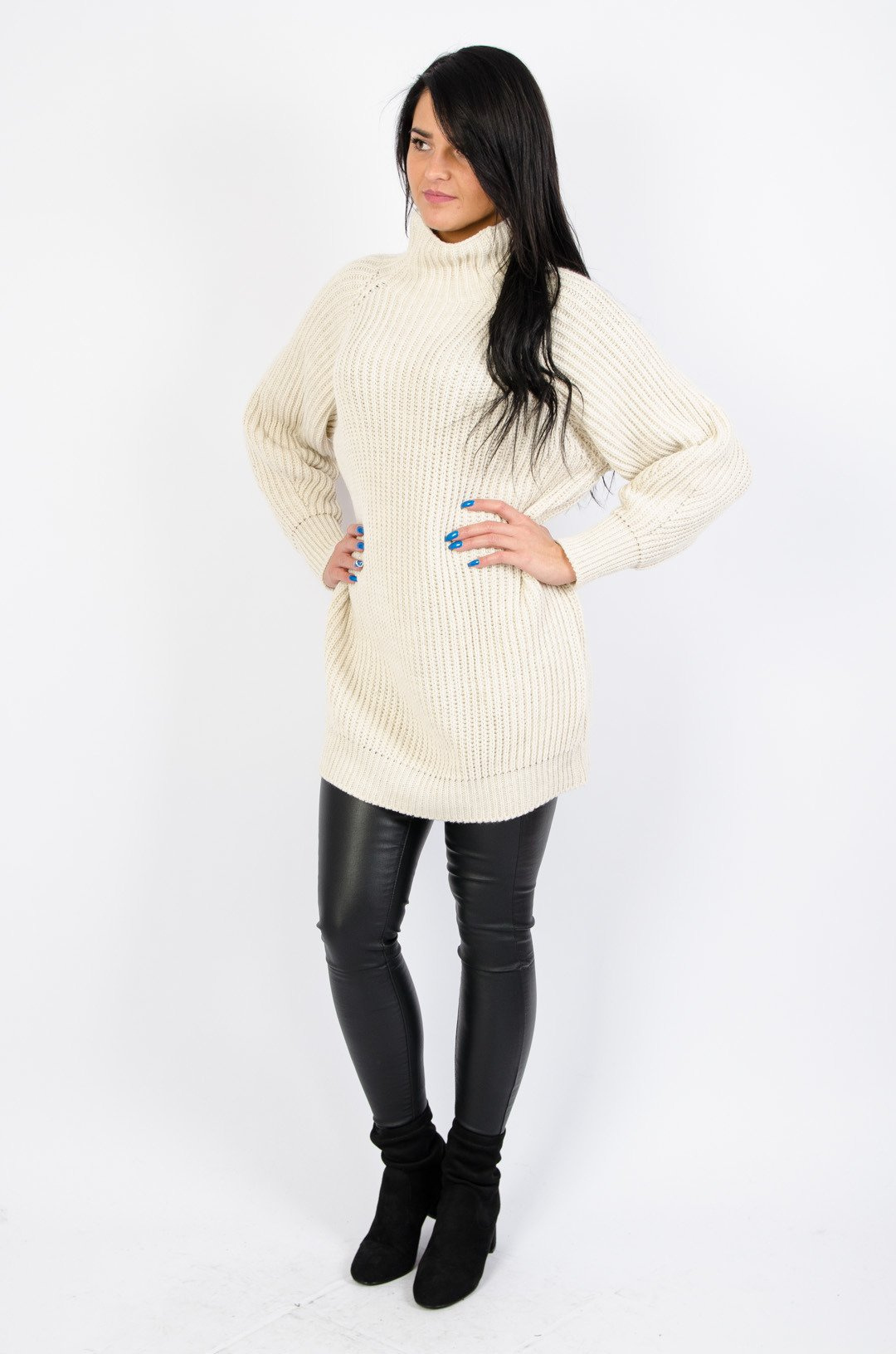 BEŻOWY DŁUGI SWETER Z PÓŁGOLFEM