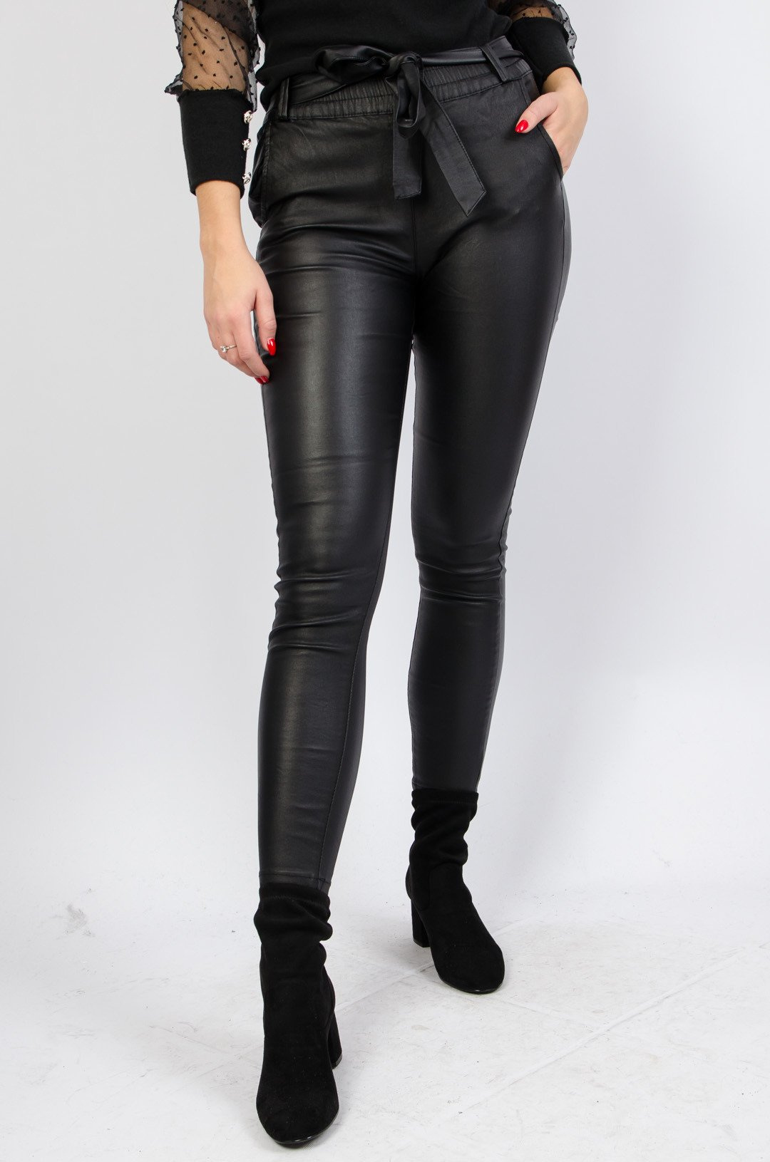 CZARNE WOSKOWANE SPODNIE Z WIĄZANIEM W PASIE- WYSOKI STAN