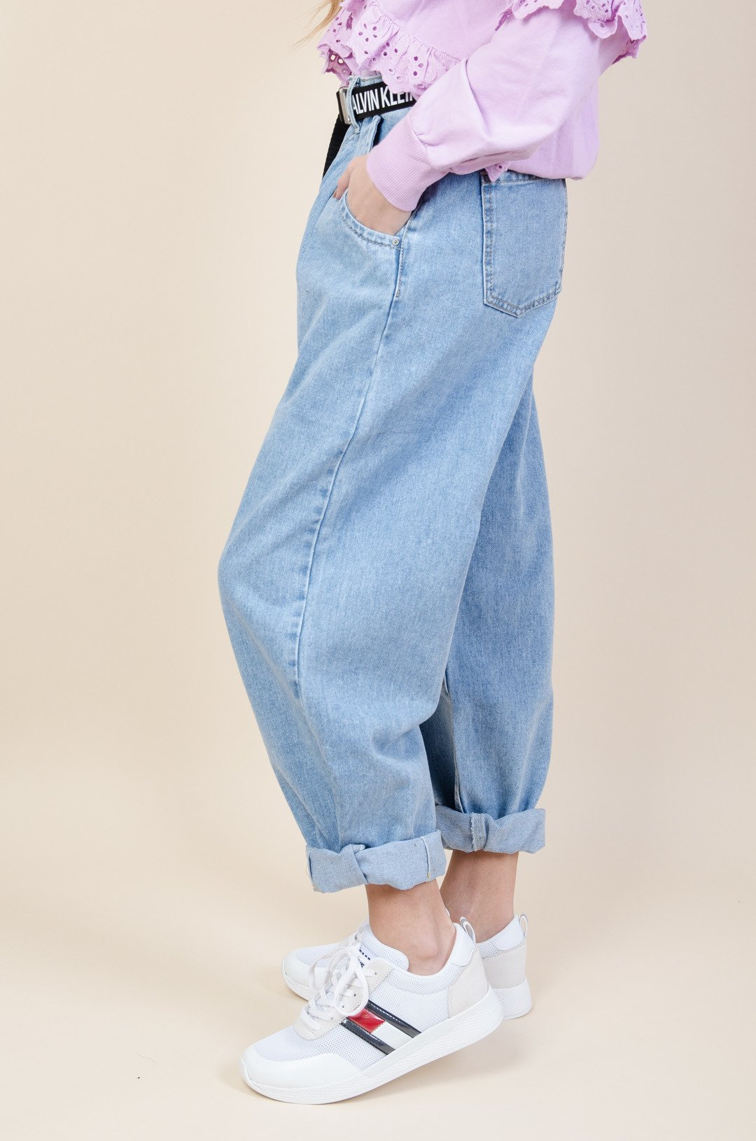 Niebieskie spodnie typu balloon jeans z wysokim stanem