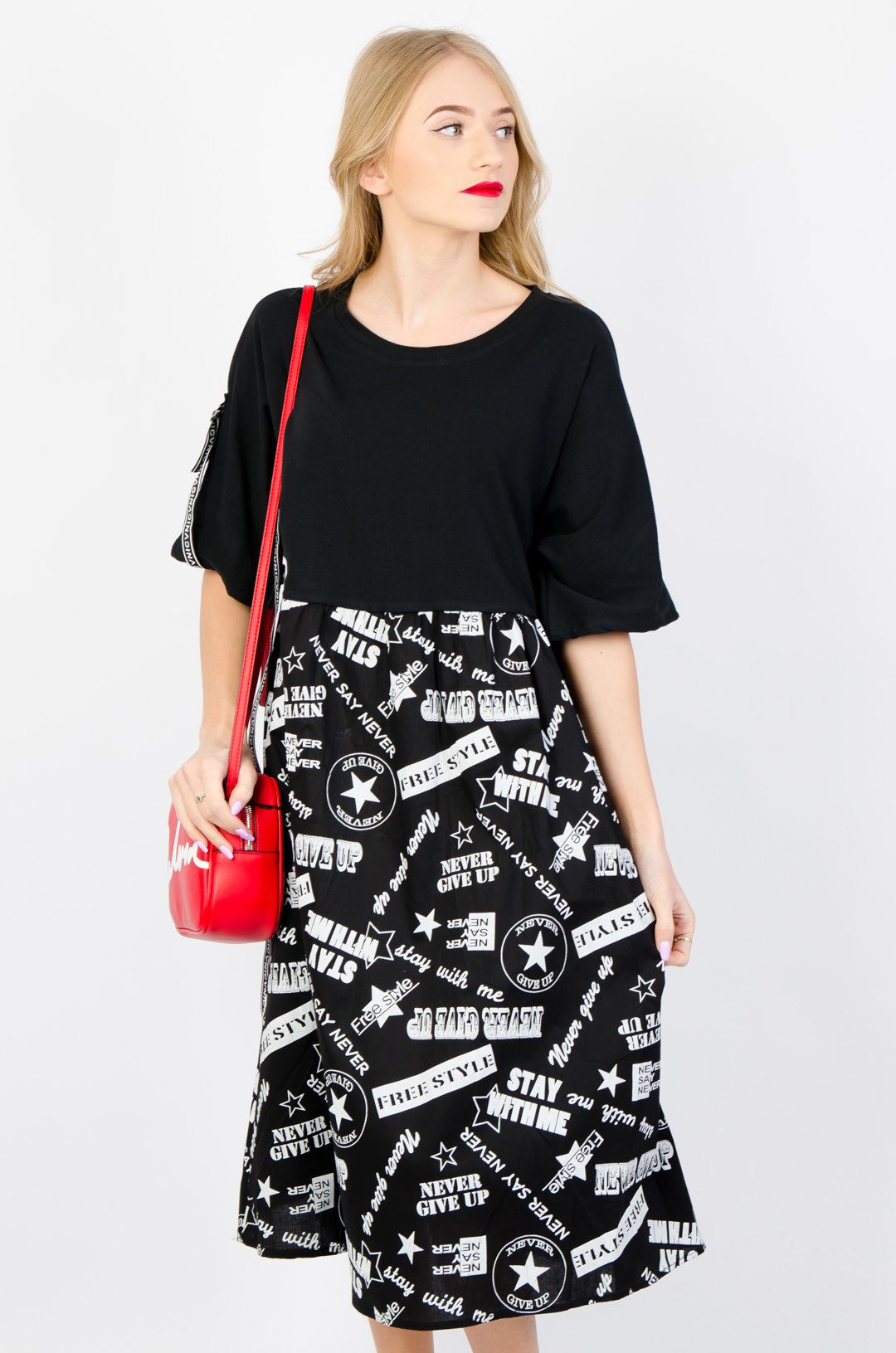 CZARNA ROZKLOSZOWANA SUKIENKA Z NAPISAMI
