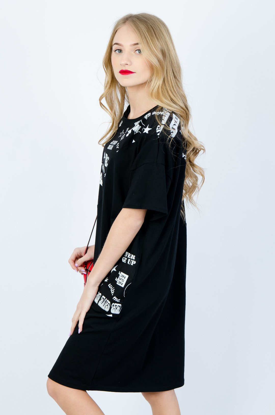 BAWEŁNIANA SUKIENKA OVERSIZE Z NAPISAMI W KOLORZE CZARNYM
