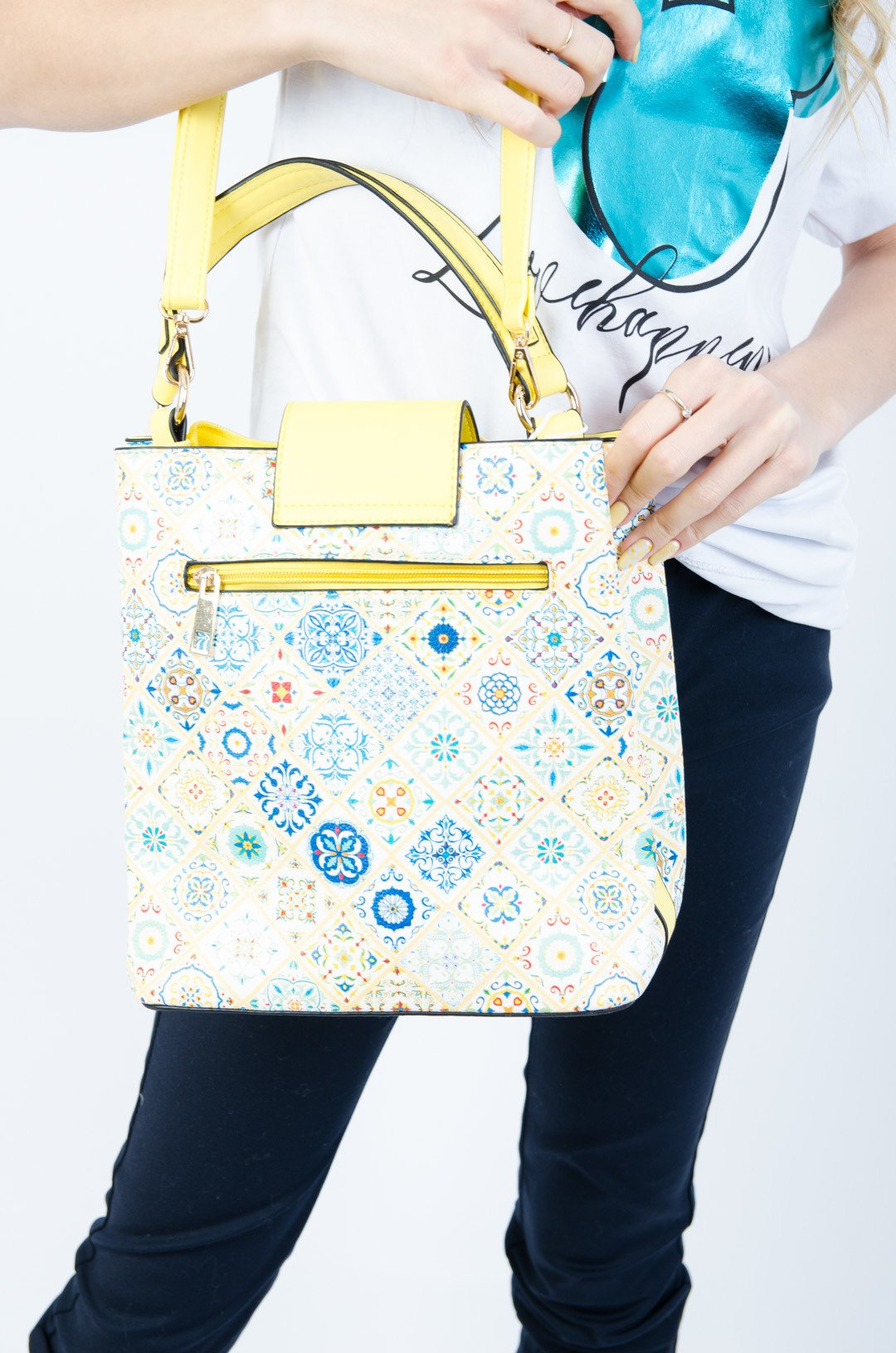 Żółta torebka w kolorowe wzory