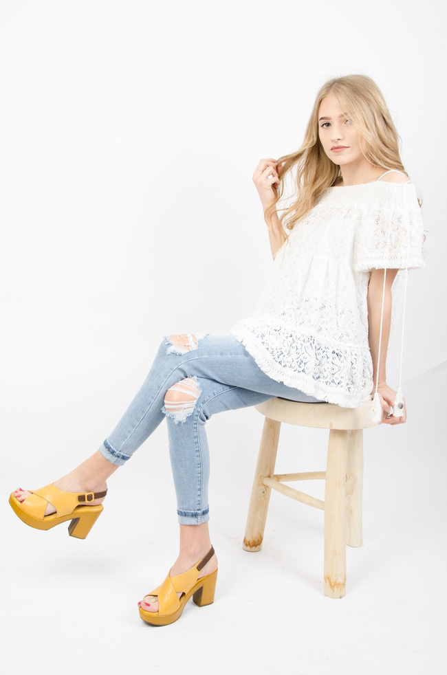 Biała koronkowa bluzka z gumą w dekolcie oraz ramiączkami ze sznurka