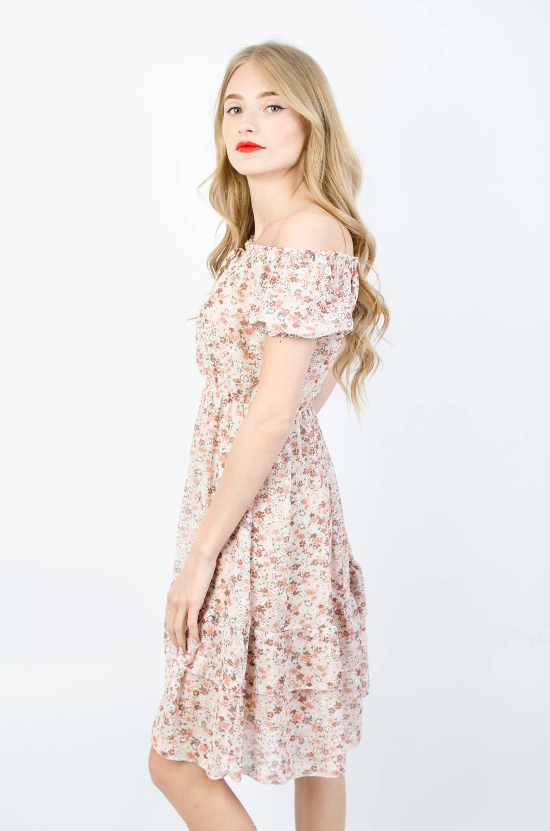 BEŻOWA SUKIENKA HISZPANKA Z KWIATOWYM WZOREM