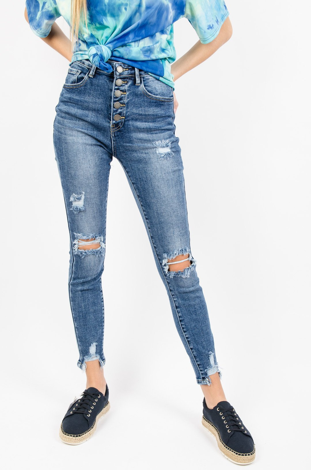 CIEMNE JEANSOWE SPODNIE ZAPINANE NA GUZIKI -WYSOKI STAN
