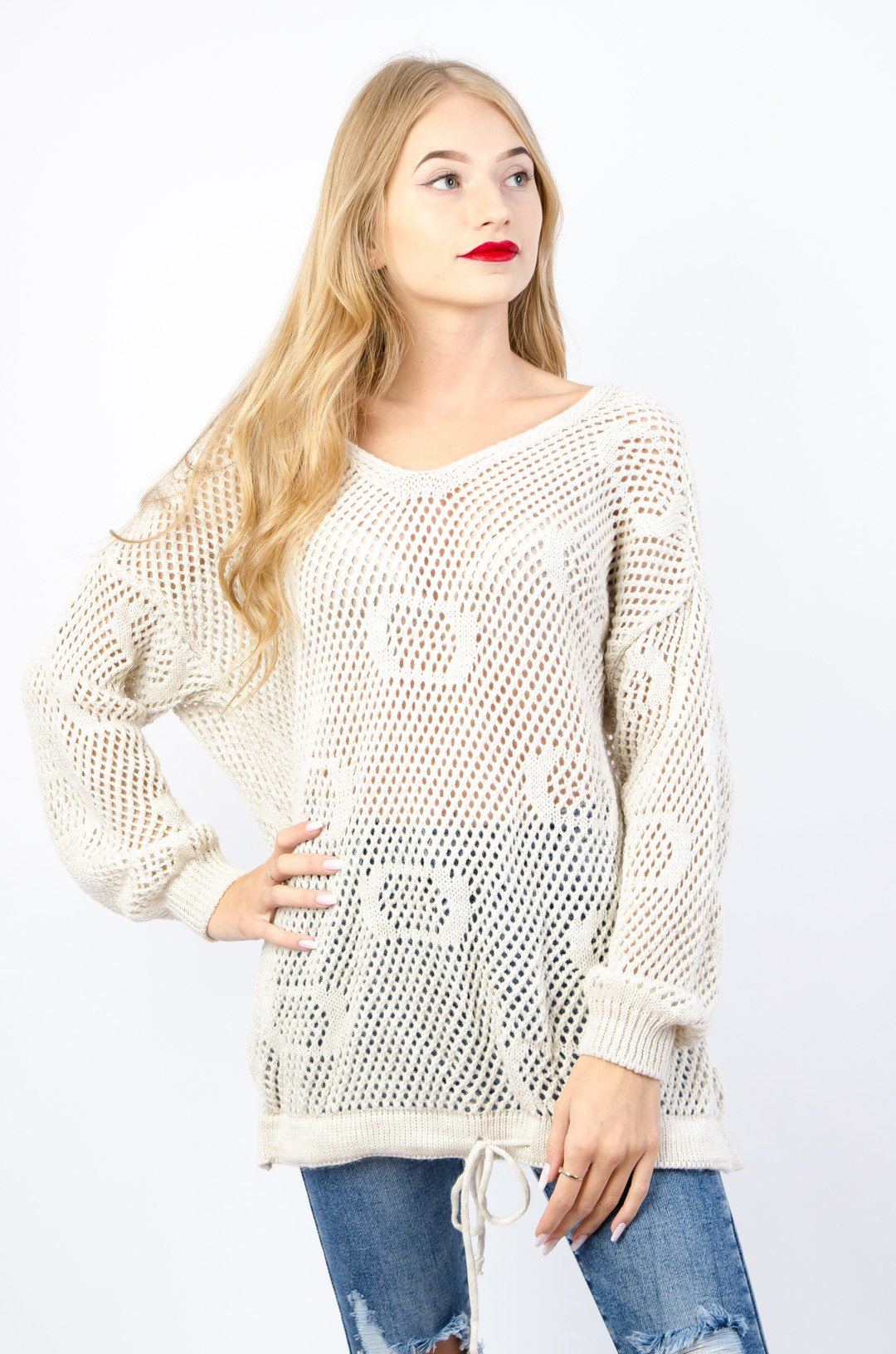 AŻUROWY SWETER W KOLORZE BEŻOWYM Z KAPTUREM.