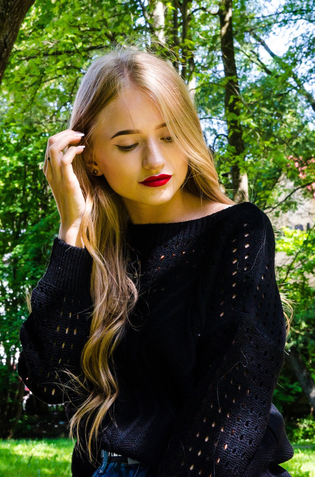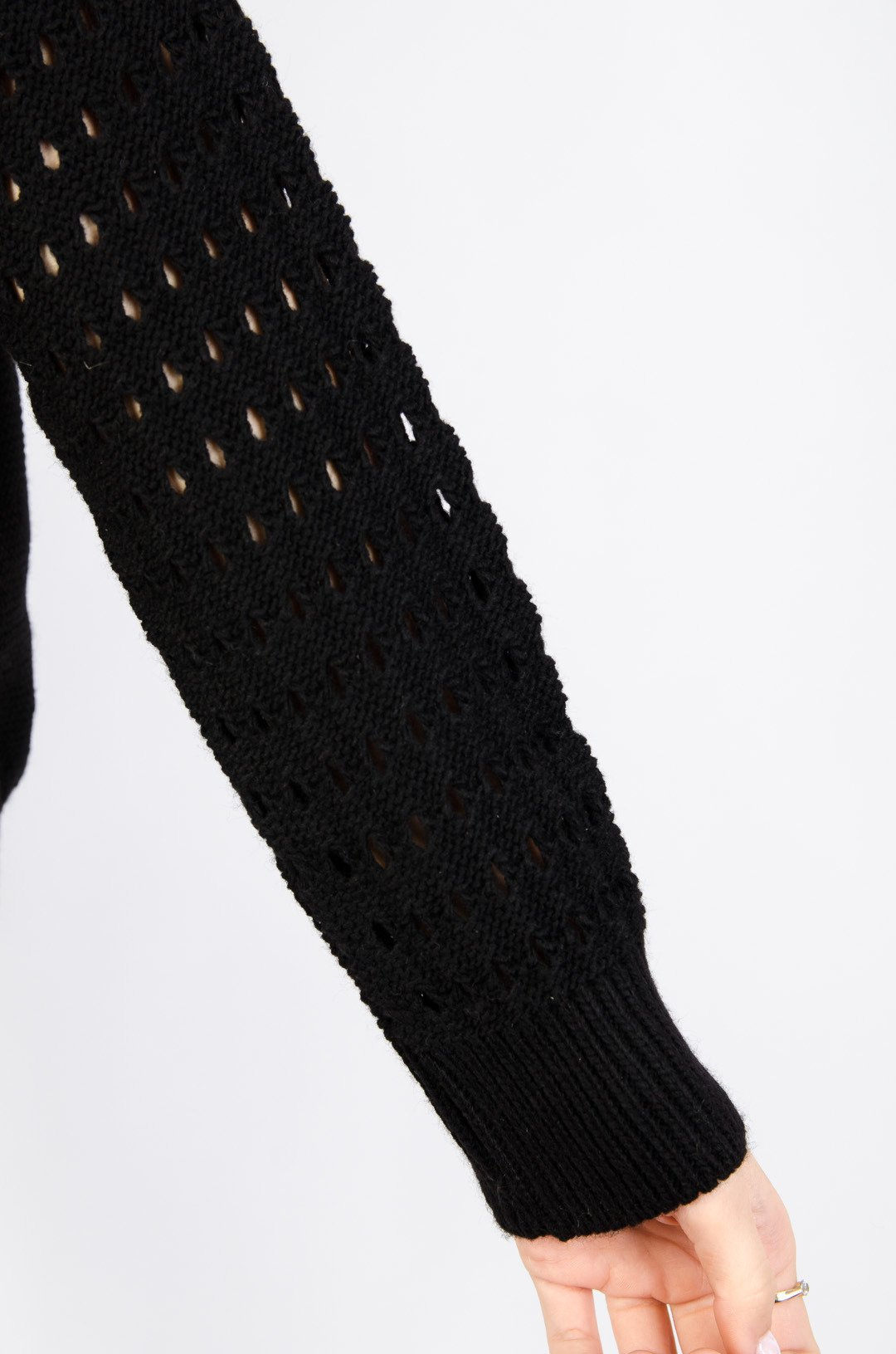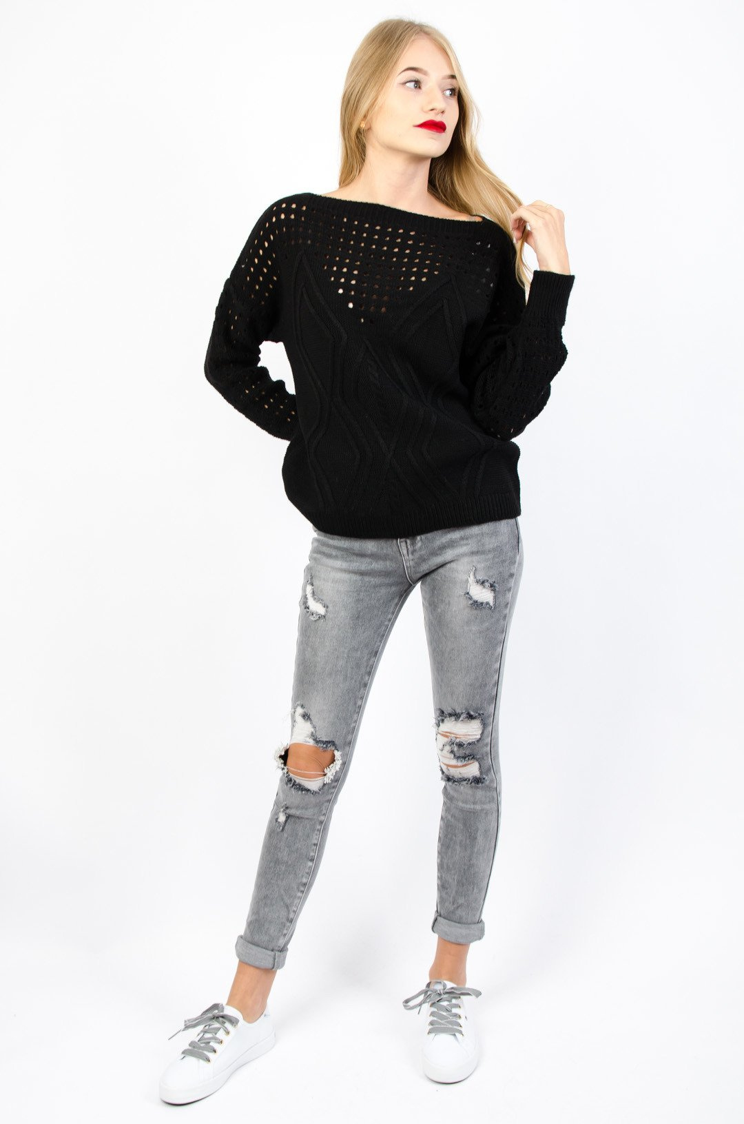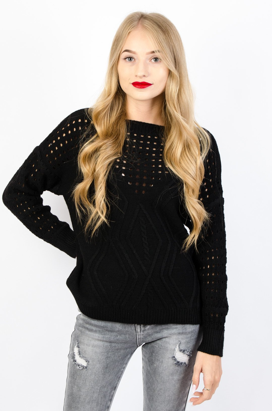 CZARNY SWETER Z AŻUROWĄ GÓRĄ ORAZ RĘKAWAMI