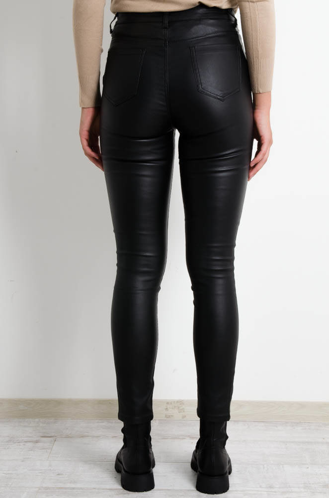 CZARNE SPODNIE WOSKOWANE Z PRZESZYCIAMI NA NOGAWKACH - IMITACJA SKÓRY
