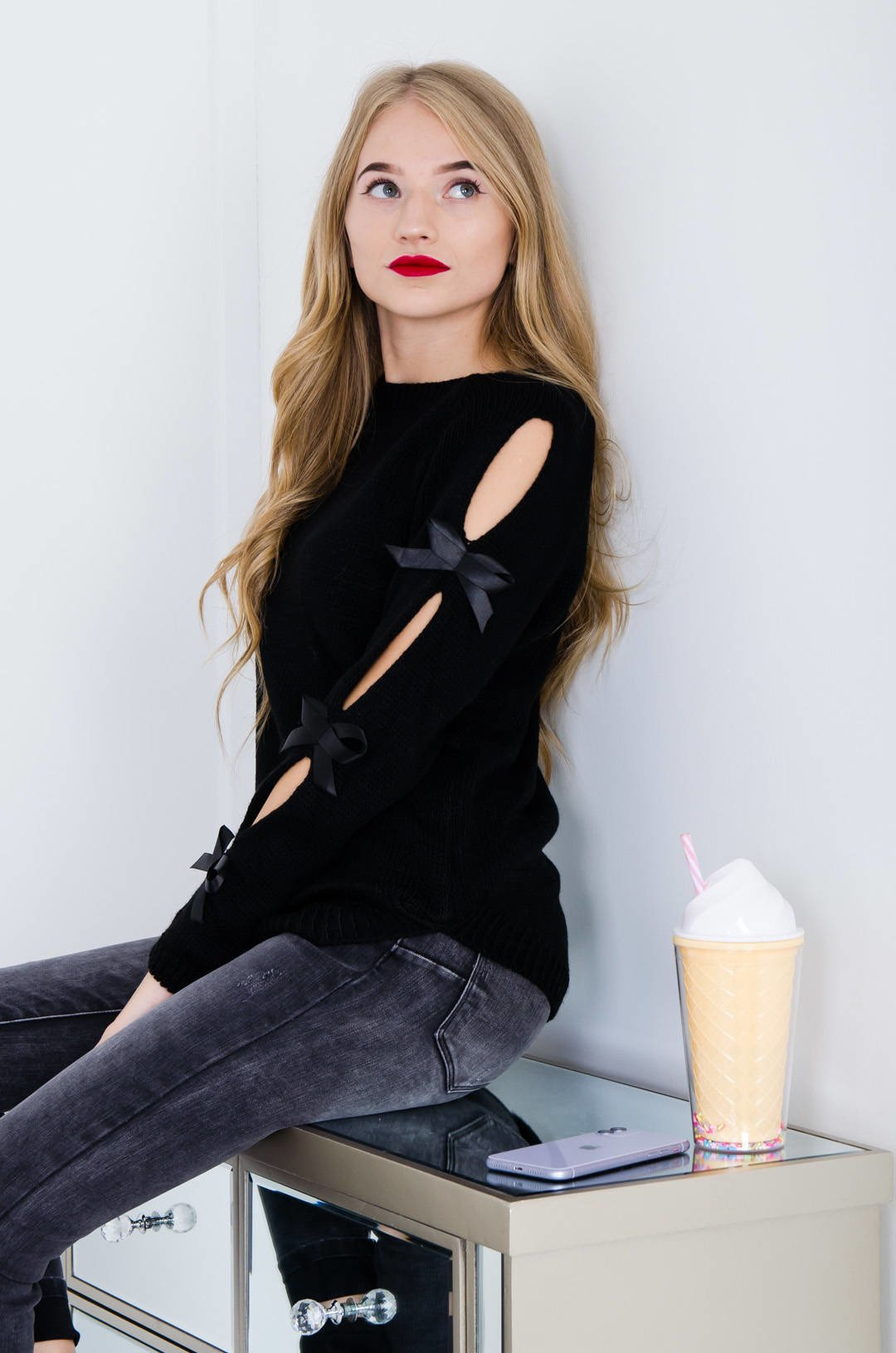 CZARNY AKRYLOWY SWETER Z WSTĄŻKAMI NA RĘKAWACH