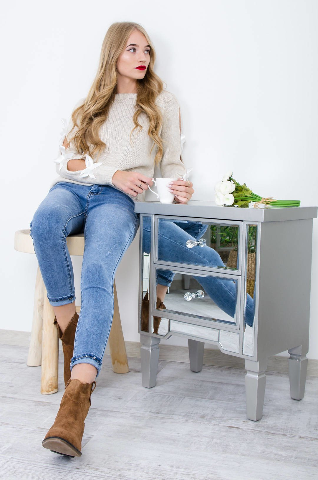 BEŻOWY AKRYLOWY SWETER Z WSTĄŻKAMI NA RĘKAWACH