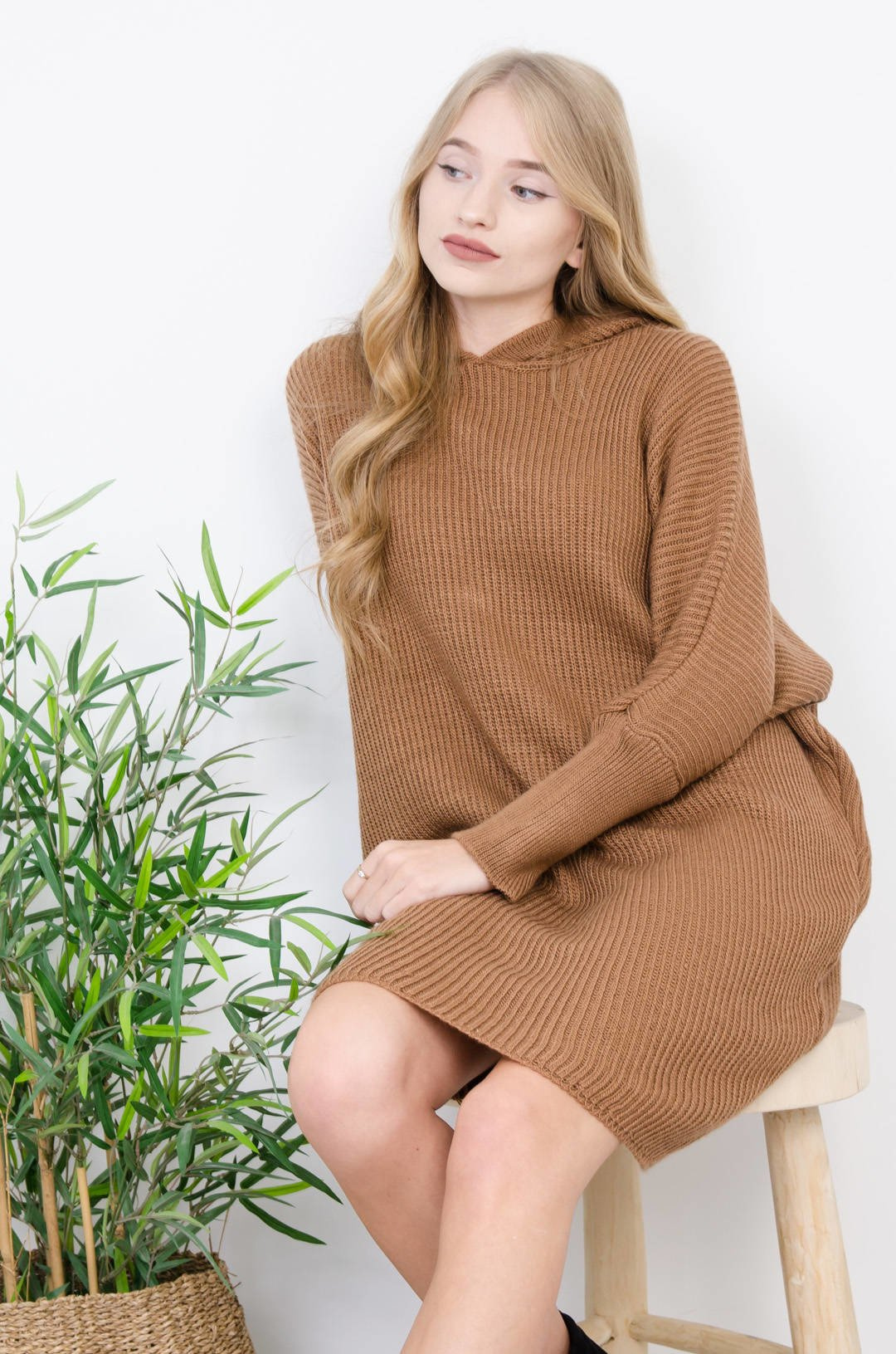 BRĄZOWA SUKIENKA SWETERKOWA Z KAPTUREM