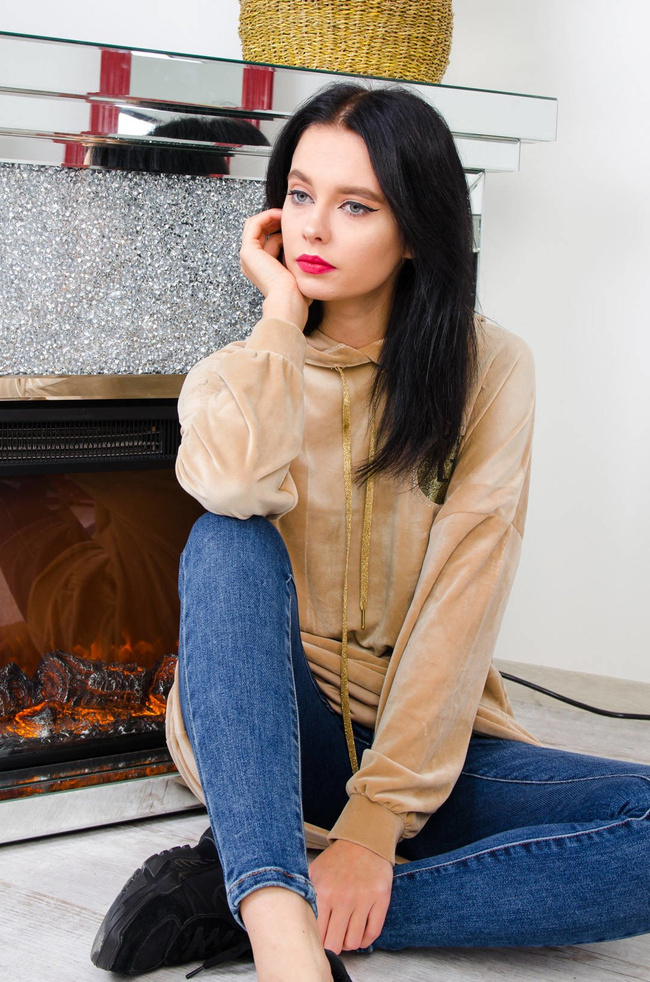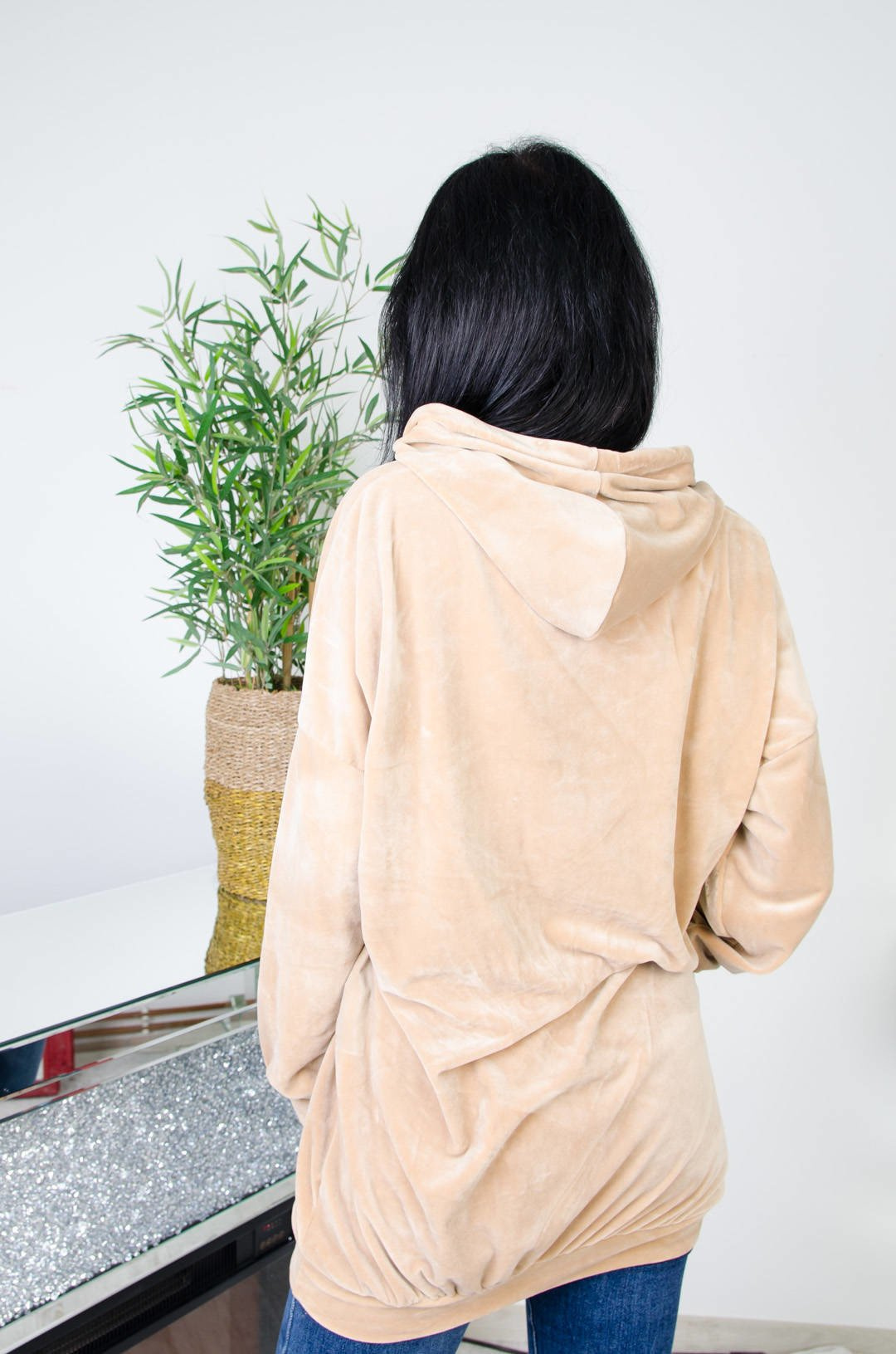 BEŻOWA WELUROWA DŁUGA BLUZA Z NASZYWKĄ.