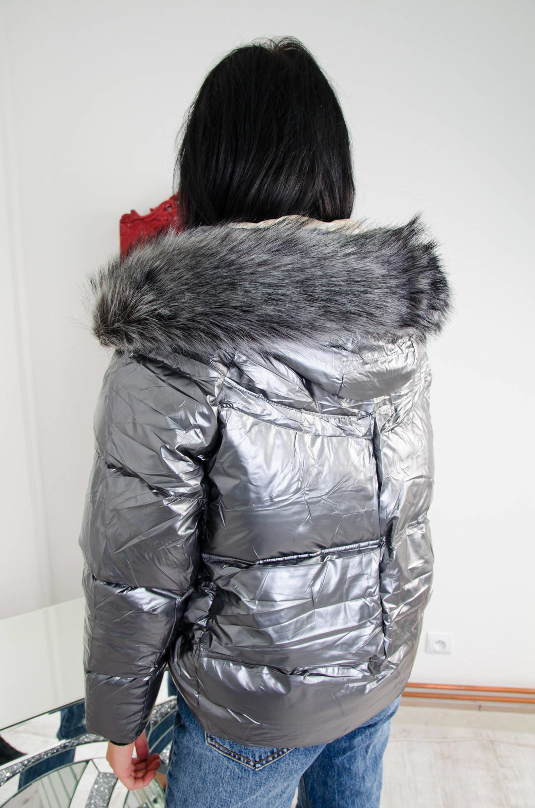 KRÓTKA SZARA METALICZNA KURTKA Z FUTERKIEM