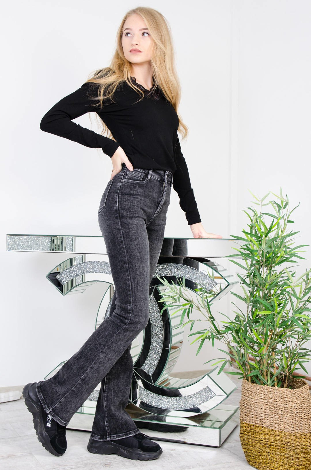 CIEMNO-SZARE SPODNIE JEANSOWE DZWONY Z WYSOKIM STANEM