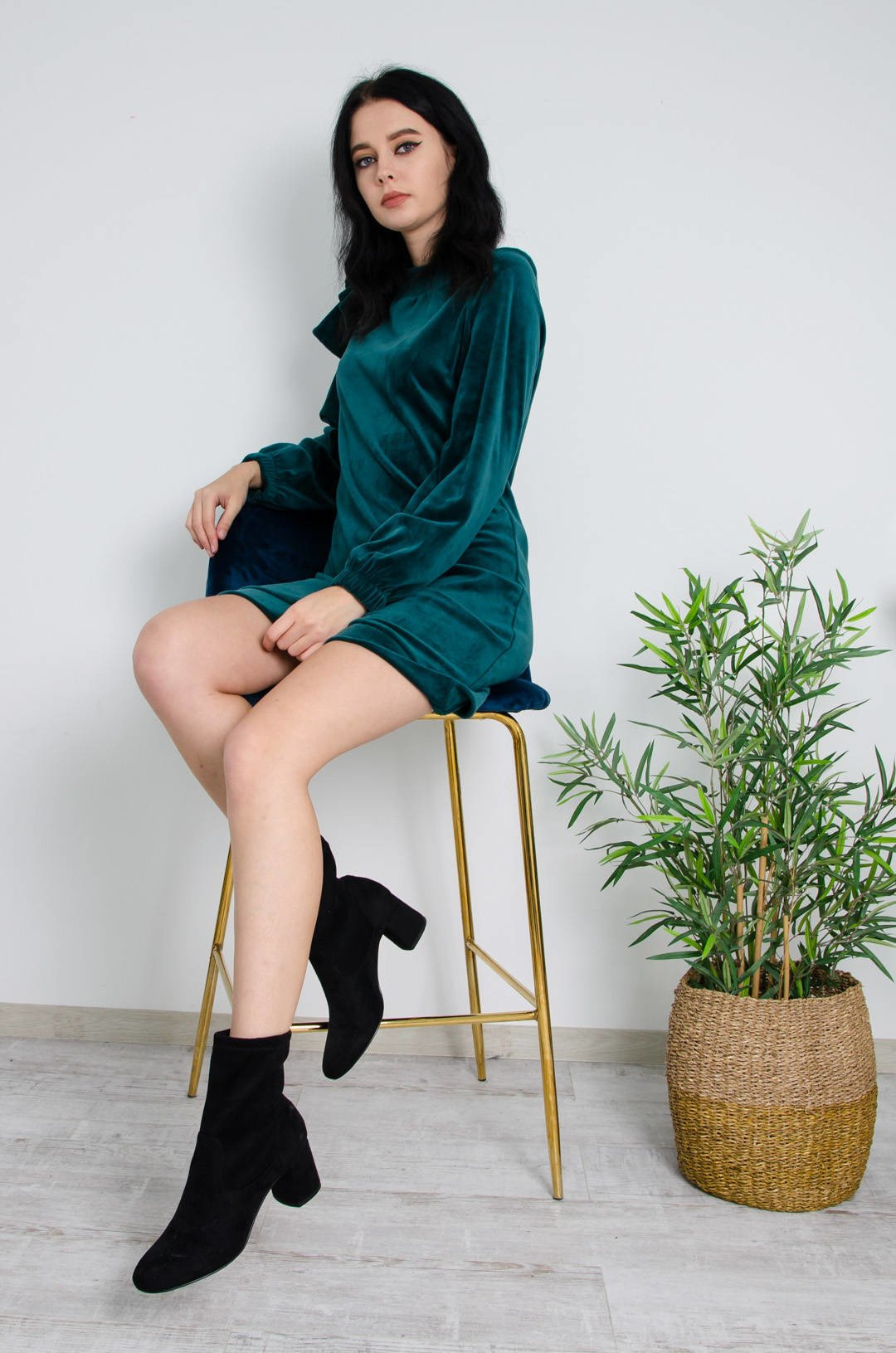 SZMARAGDOWA WELUROWA SUKIENKA Z FALBANĄ NA RAMIENIU