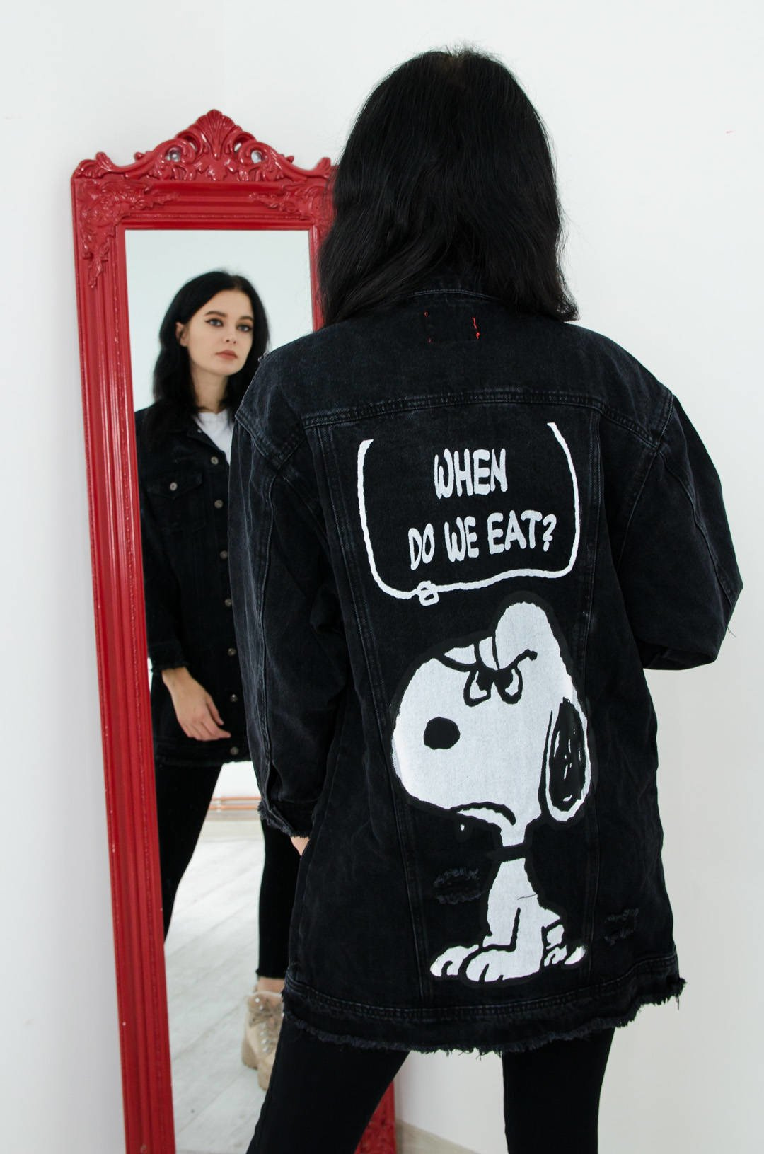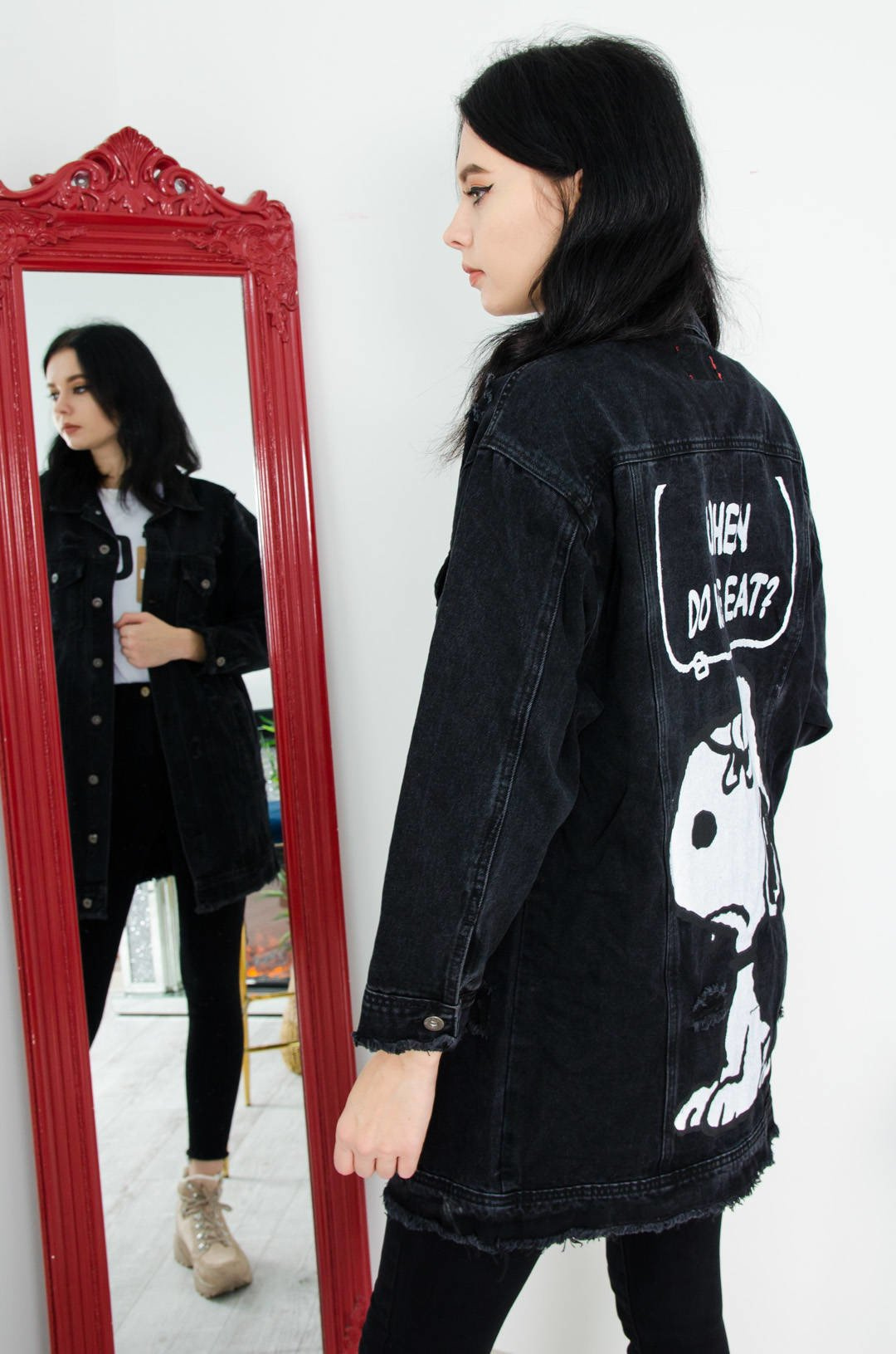 DŁUGA CZARNA KURTKA JEANSOWA Z APLIKACJĄ NA PLECACH