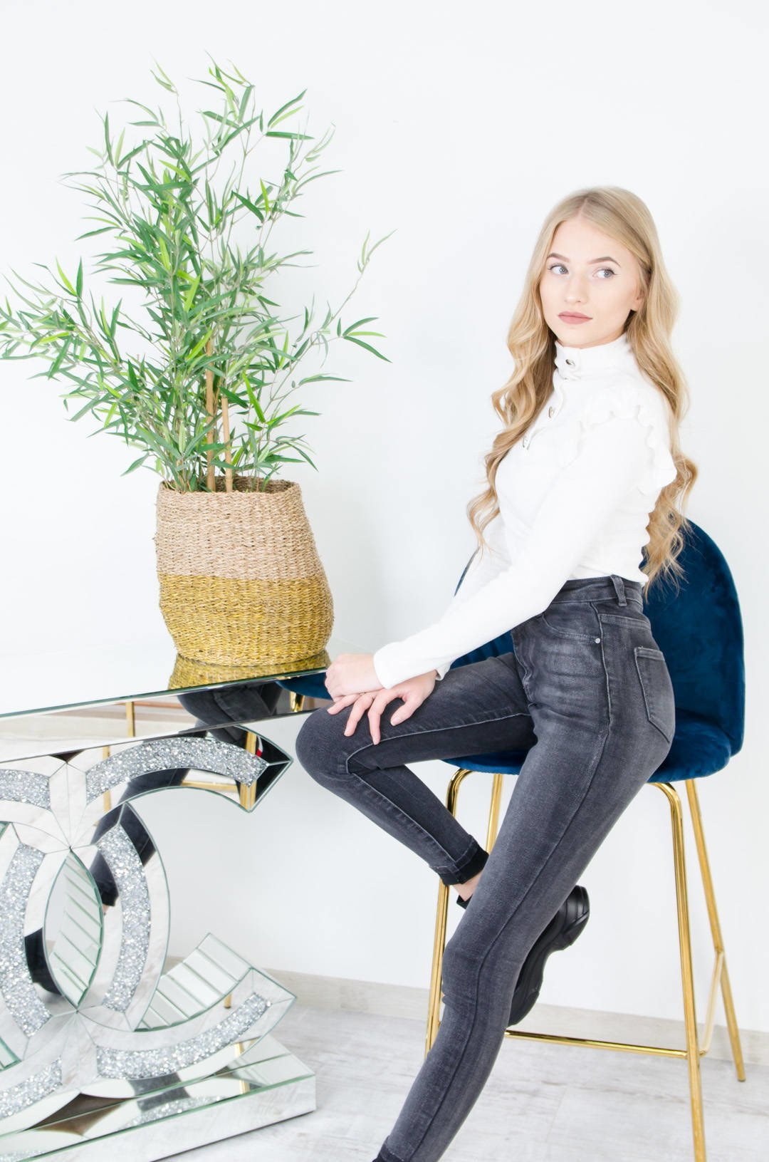 BIAŁA PRĄŻKOWANA BLUZKA Z FALBANKAMI-PÓŁGOLF